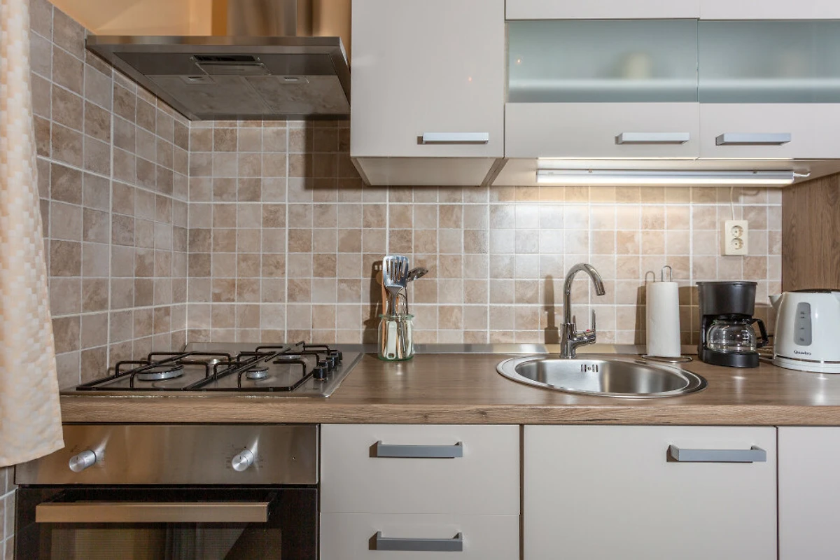 De open keuken, met gasfornuis, is uitgerust met oven, servies/bestek, keukengerei en koffiezetapparaat.