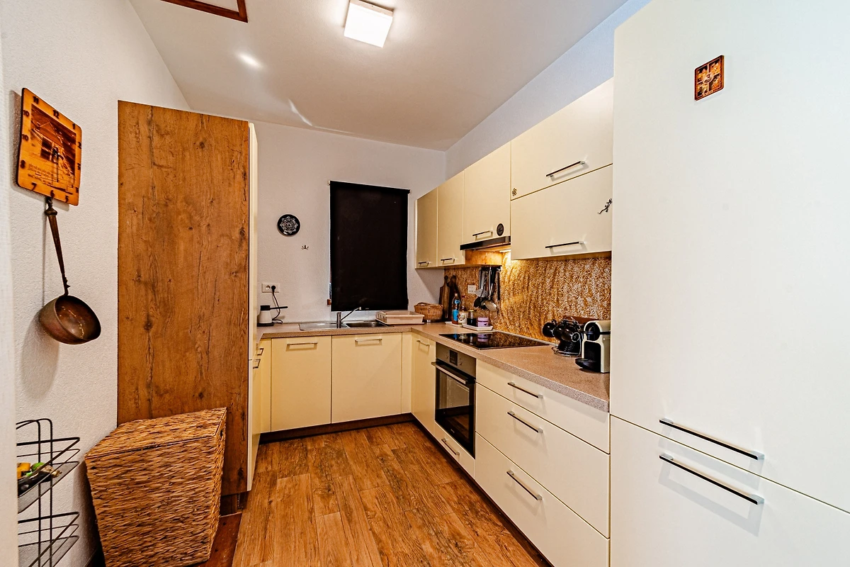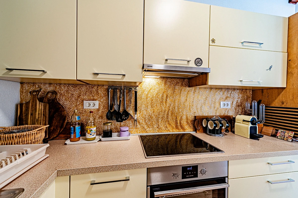 De open keuken, met inductie kookplaat, is uitgerust met koelkast, magnetron, oven, vriezer, vaatwasmachine, servies/bestek, keukengerei, koffiezetapparaat en broodrooster.