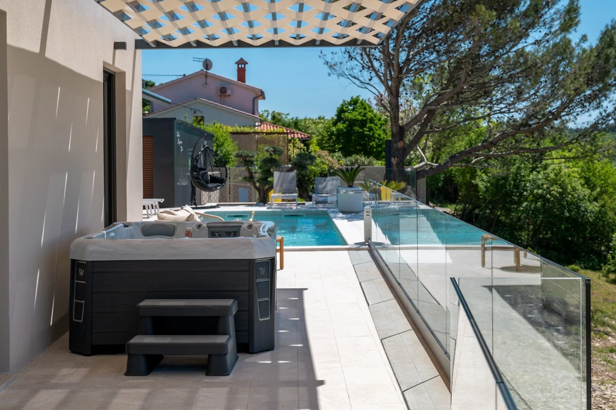 Tevens heeft u de beschikking over tuin, tuinmeubilair, omheind perceel, terras, wasmachine, droger, barbecue, openhaard, strijkijzer, internet (wifi), haardroger, jacuzzi, spa, warmtepomp, airconditioning, verwarmd zwembad privé, garage in in het zelfde gebouw, Televisie, satelliet tv.