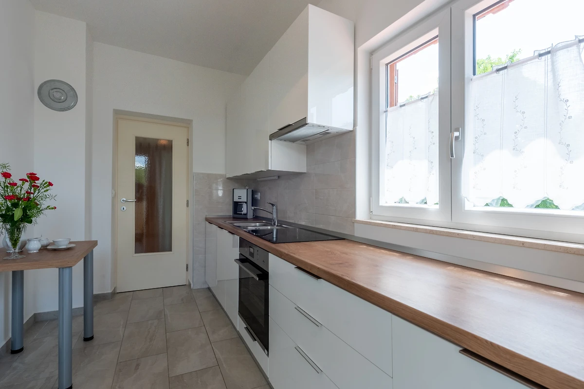 De open keuken, met keramisch fornuis, is uitgerust met koelkast, magnetron, oven, vriezer, servies/bestek, koffiezetapparaat en waterkoker.