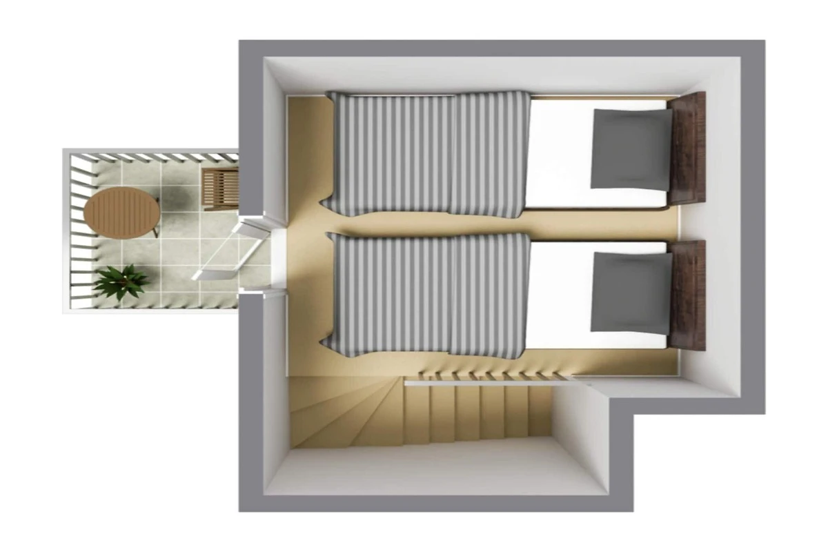 Keuken(koffiezetapparaat, koelkast(+ vriesvak)), woon/slaapkamer(2x 1-pers. vouwbed, 2-pers. vouwbed, TV), slaapkamer(2-pers. bed), badkamer(wasbak, douche, toilet), verwarming(CV), terras, tuinmeubilair, parking, speeltoestellen, voetbalgoal