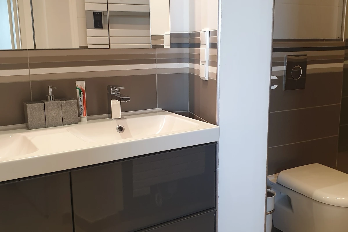 Het is perfect geschikt voor 4 personen en beschikt over twee slaapkamers, een badkamer, evenals een woonkamer met open keuken en een groot terras van 39 m² (420 sq. ft).