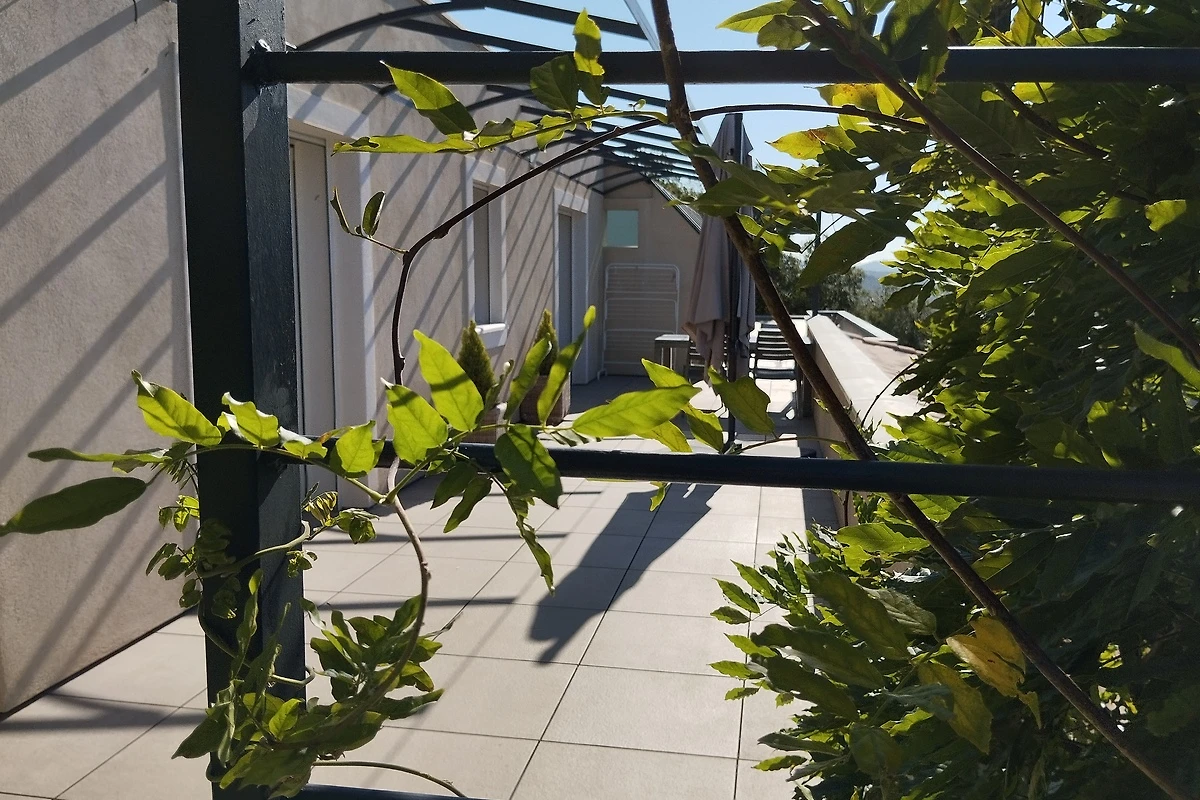 Alle openingen zijn op het zuiden gericht en voorzien van schuiframen, waarvan het onderste profiel niet boven de vloer uitsteekt, wat de overgang van binnen naar buiten en omgekeerd vergemakkelijkt. We hebben een bibliotheek met honderden boeken, waarvan de meeste in het Frans zijn, ter beschikking gesteld. Voor hete zomernächte is er een plafondventilator beschikbaar, die meestal voldoende is. Wij zijn een vakantiebestemming zonder televisie, ook voor onszelf. Daarvoor is er wifi beschikbaar.