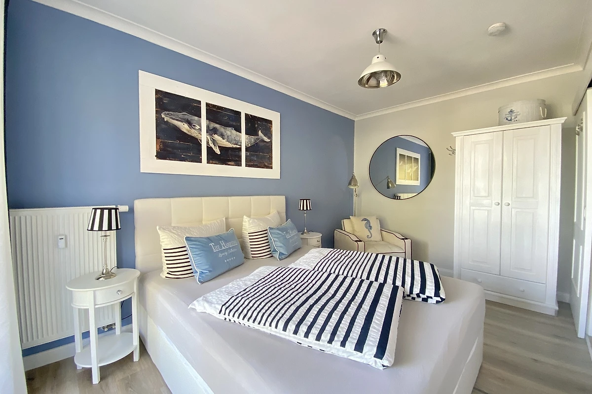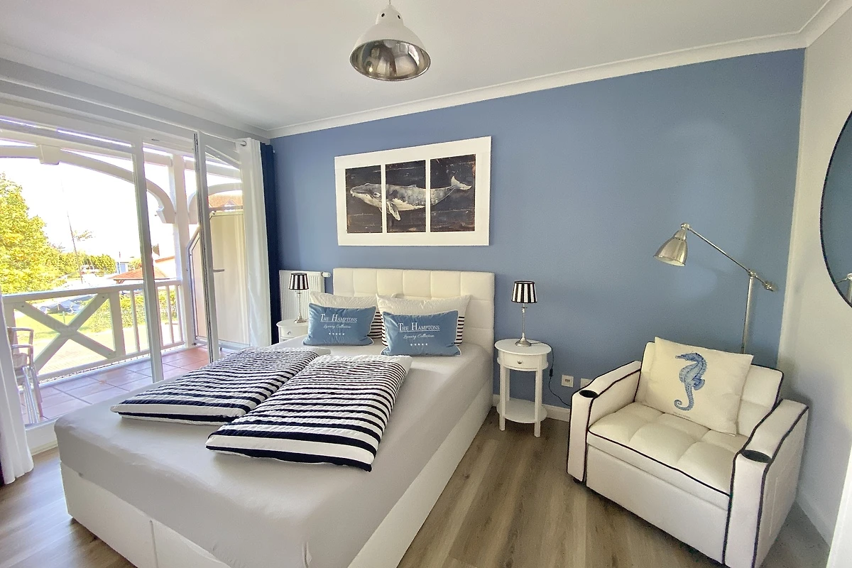 De twee aparte slaapkamers (beide met led-tv), die ook aan de zeezijde liggen, hebben dubbele grote openslaande deuren