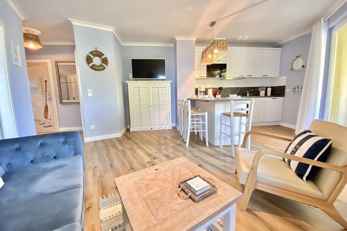 Lederen bank met fauteuil en 43" Smart-TV (kabel), de eethoek en de open, volledig uitgeruste keuken met