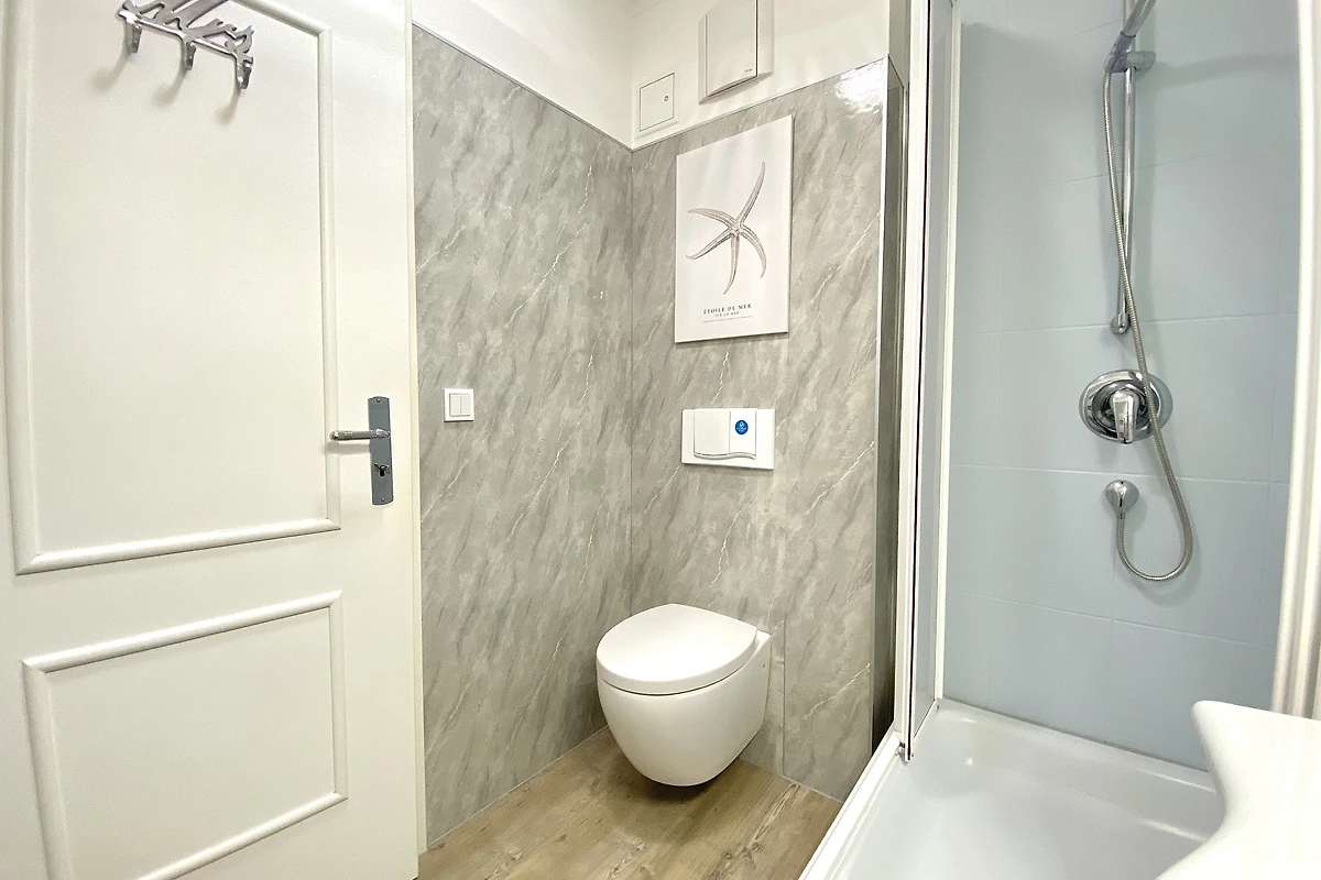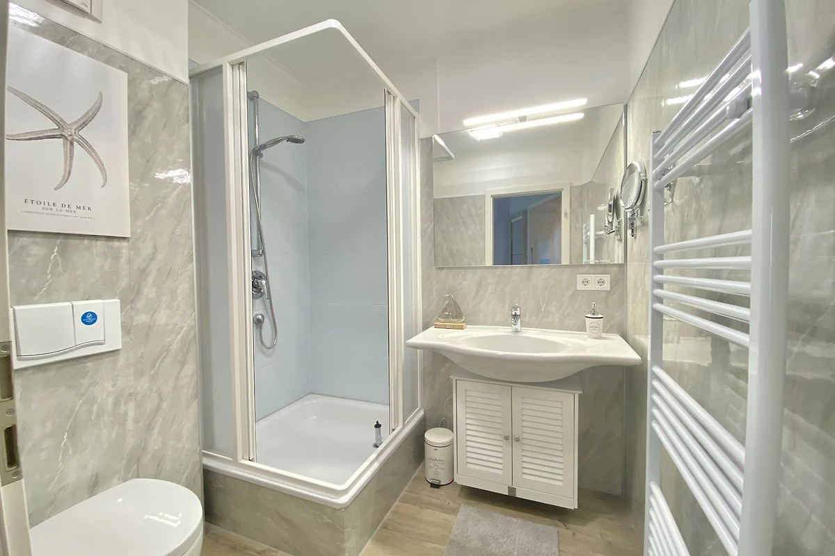 In het appartement vindt u een badkamer met douche en WC, haardroger en make-up spiegel,
