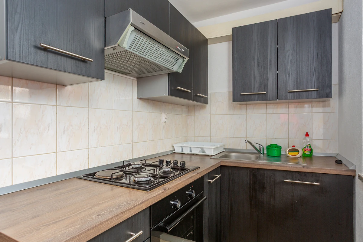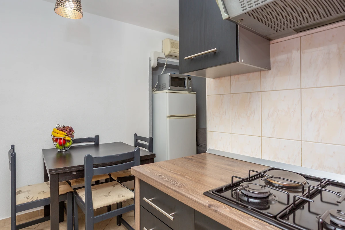 De open keuken, met gasfornuis, is uitgerust met koelkast, magnetron, oven, servies/bestek, keukengerei en koffiezetapparaat.