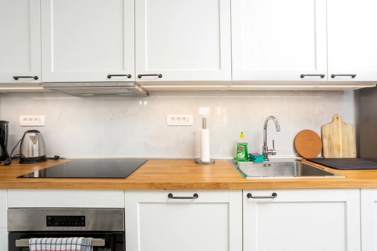 De open keuken, met keramisch fornuis, is uitgerust met koelkast, magnetron, oven, vriezer, vaatwasmachine, servies/bestek, keukengerei en koffiezetapparaat.