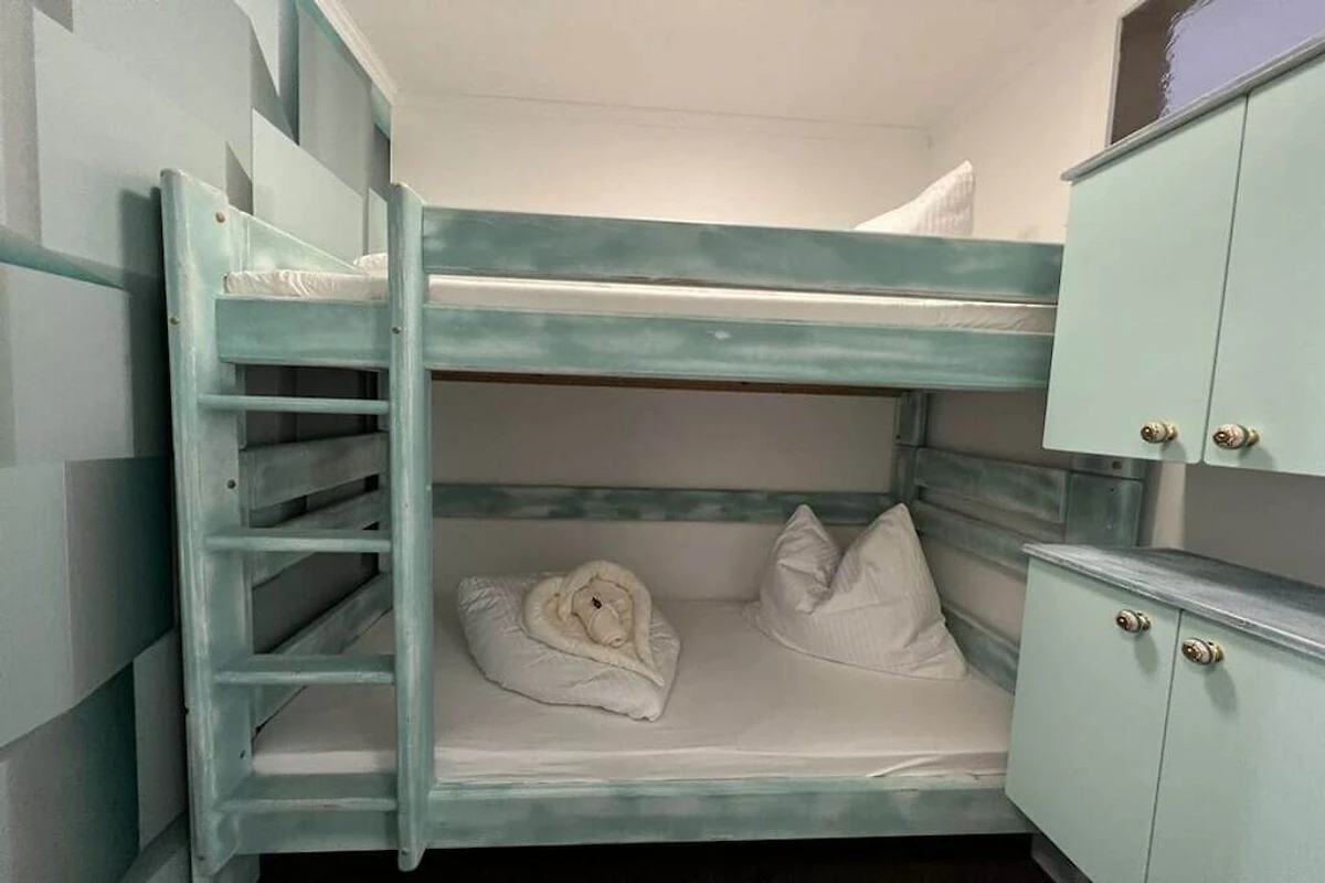 Parterre: (woon/eetkamer(, , , bibliotheek, 2-pers. slaapbank, TV, eettafel, radio), slaapkamer(stapelbed))