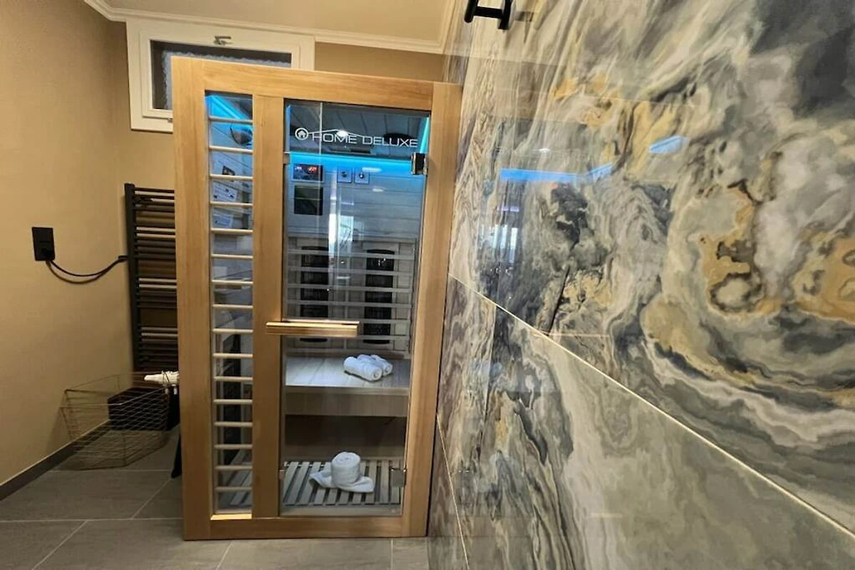 Zwem in het panoramische binnenzwembad, ontspan in de sauna of geniet van de warmte van de infraroodcabine voor spierontspanning.