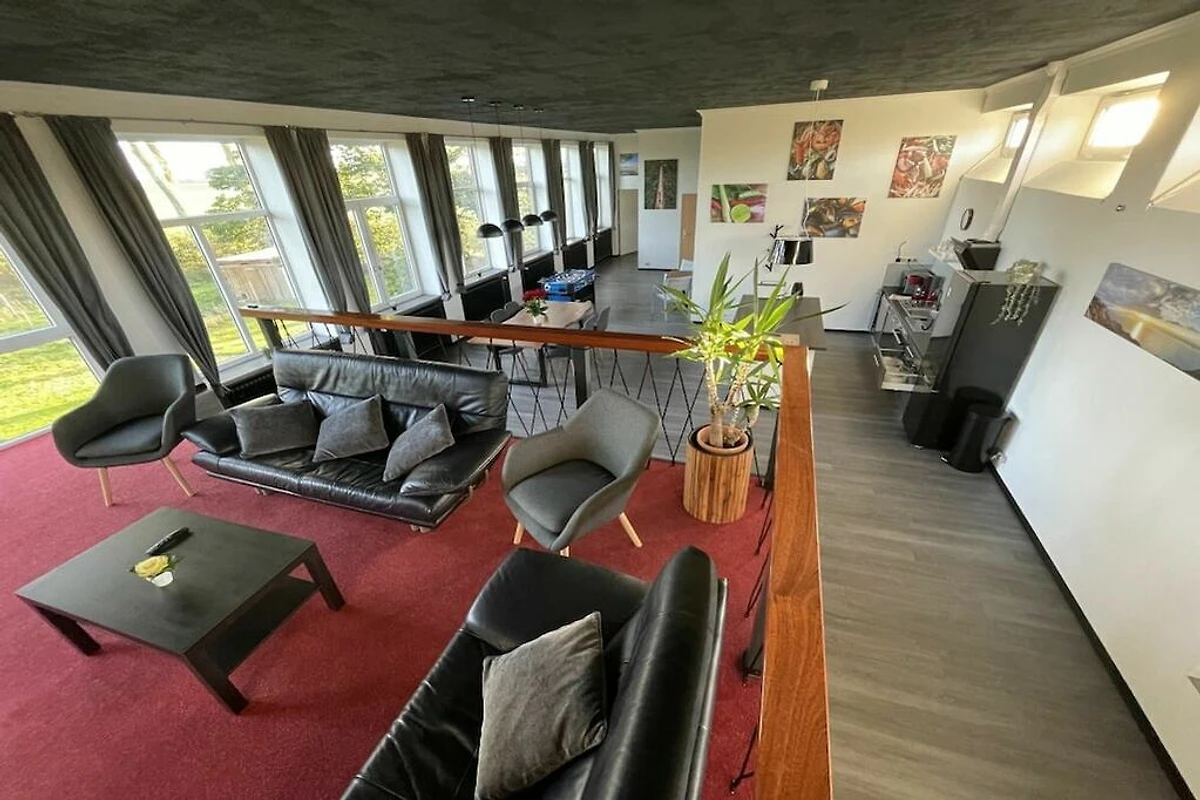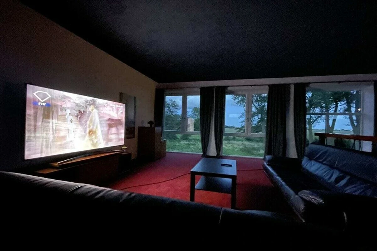 Op de bovenverdieping bevinden zich een 75-inch tv en de woonkamer. Kamerhoge ramen bieden uitzicht tot aan de Noordzeedijk.