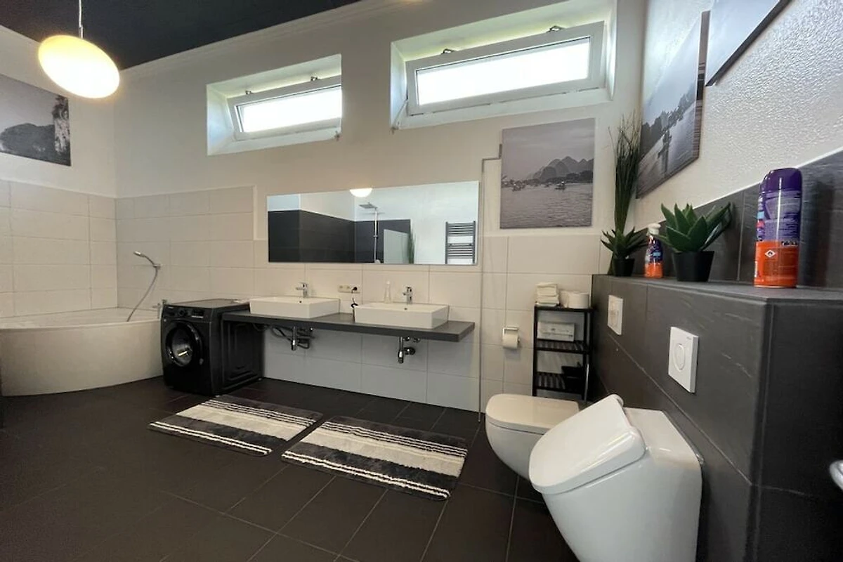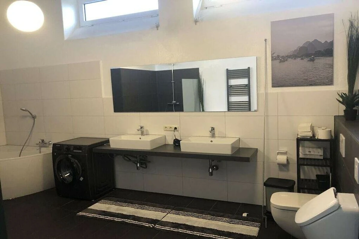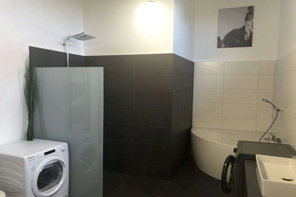 Een grote badkamer is zichtbaar met een ligbad, douche, wasmachine en droger.