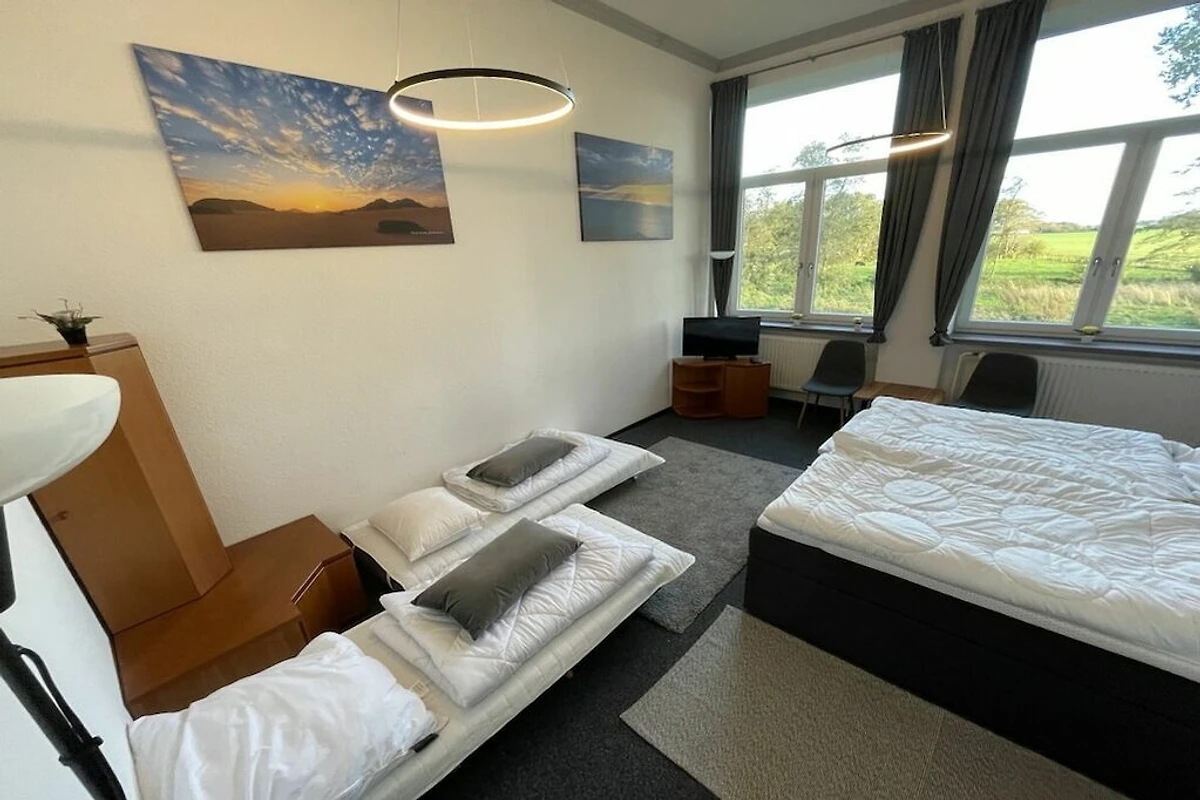 Er zijn drie slaapkamers, twee kamers voor twee personen en één kamer biedt plaats aan maximaal vier personen.