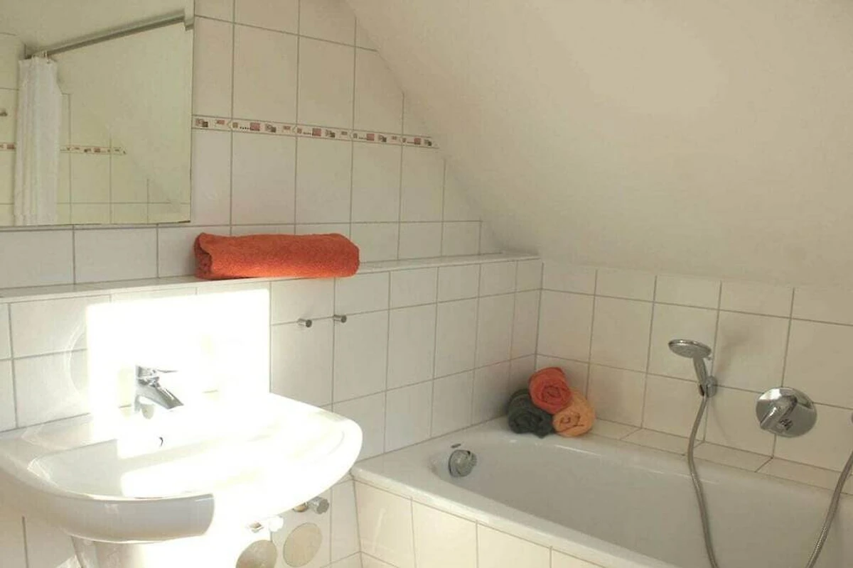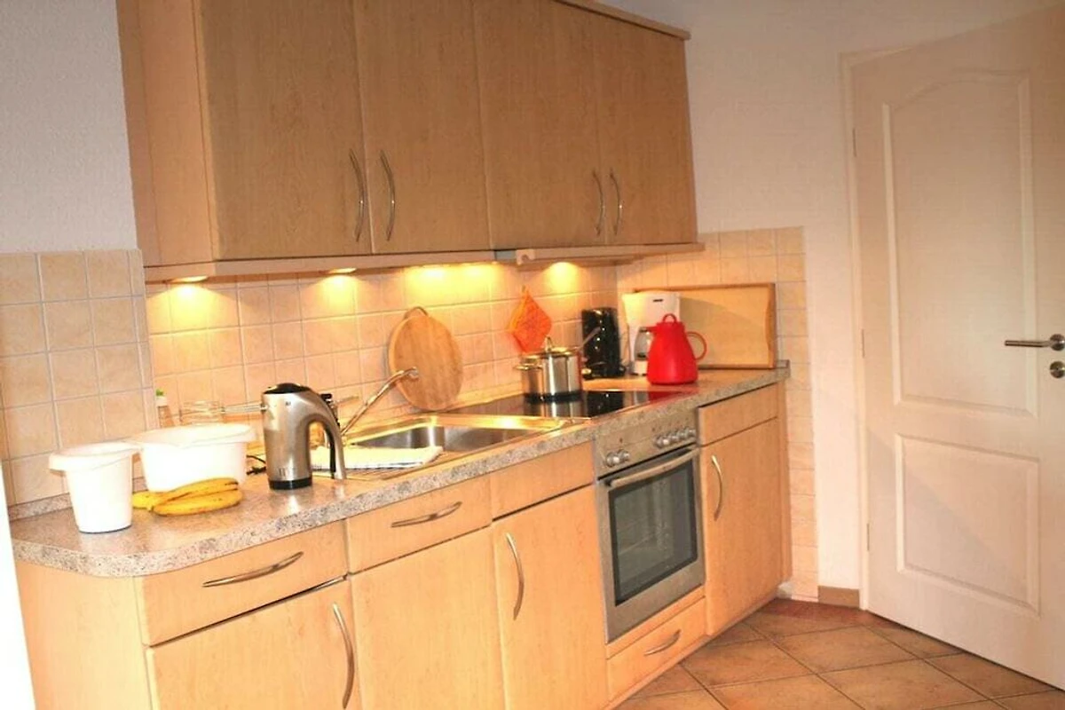 Op de 1e etage: (keuken(, , eettafel, kachel, kookplaat, waterkoker, broodrooster, koffiezetapparaat, oven, grill, magnetron, afwasmachine, koelkast, vriezer), woon/slaapkamer(, 1-pers. slaapbank, TV), slaapkamer(, , 2-pers. bed, ledikant), slaapkamer(, , 2-pers. bed, ledikant), badkamer(, toilet, ligbad, wastafel))