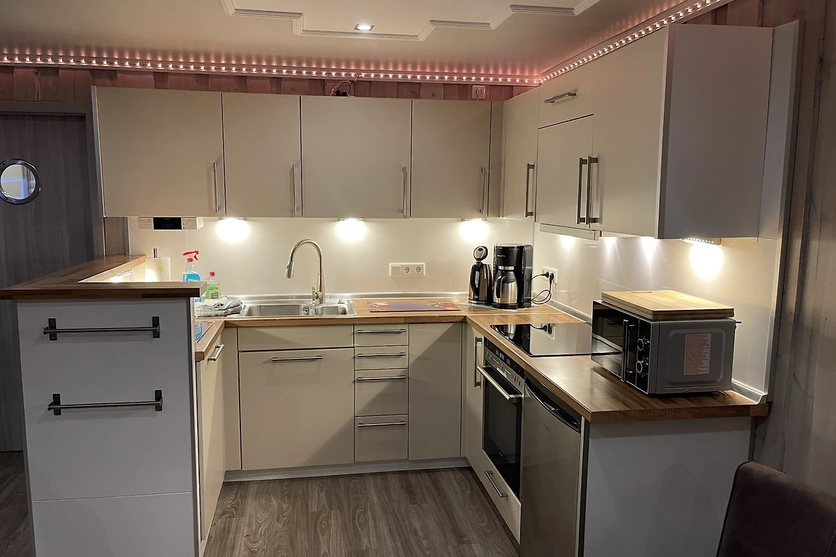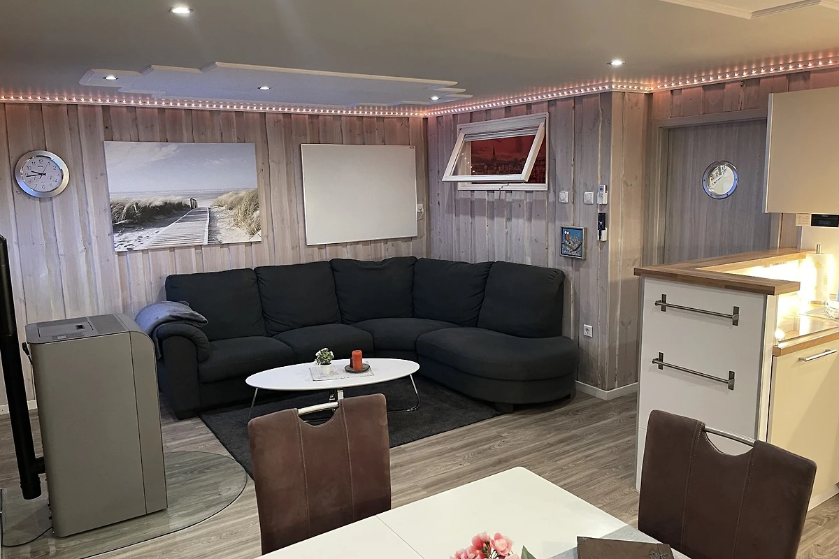 De open woon- en eetruimte met gezellige pelletkachel en extra wintertuin zorgt voor een bijzonder aangenaam woongevoel. Het vakantieappartement biedt daarmee een ideale plek om tot rust te komen, te ontspannen en te genieten – perfect voor stellen, gezinnen en hondenbezitters.