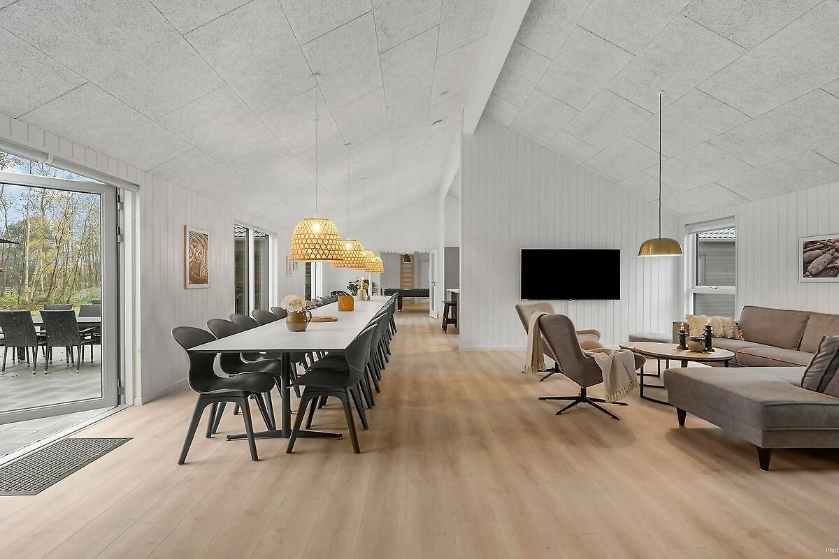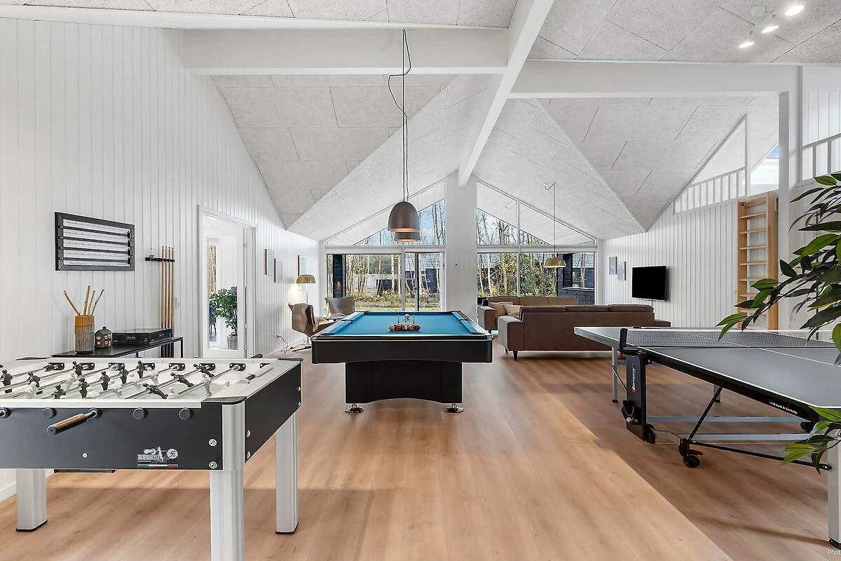Nur wenige Gehminuten vom breiten Sandstrand in Marielyst entfernt befindet sich dieses einzigartige Admiral Strandhus, das speziell für große Gemeinschaften entworfen wurde. Mit ganzen zwölf Schlafzimmern, vier Schlafplätzen auf dem Dachboden und fünf Badezimmern gibt es hier reichlich Platz, damit viele Menschen gleichzeitig zusammenkommen können – sei es für einen erholsamen Urlaub, eine festliche Feier oder ein verlängertes Wochenende mit Kollegen und Freunden. Das Haus liegt auf einem grünen Grundstück, umgeben von Bäumen, die eine gemütliche und ruhige Atmosphäre schaffen. Der Mittelpunkt ist der großzügige Aufenthaltsbereich, in dem eine XL-Küche, ein langer Esstisch und eine Sofaecke ideale Rahmenbedingungen für gemeinsames Kochen, Mahlzeiten und entspannte Stunden bieten. Der Raum ist außerdem mit Projektor, Leinwand und Whiteboard ausgestattet, sodass er sowohl für private Aufenthalte als auch für geschäftliche Veranstaltungen genutzt werden kann. Wasserliebhaber erwartet der hauseigene Poolbereich, in dem sowohl Kinder als auch Erwachsene viele Stunden mit Spielen, Schwimmen und Entspannung verbringen können. Wer zusätzliche Verwöhnung sucht, findet im Außen-Wellnessbereich die perfekte Ergänzung. Hier können Sie Whirlpool, Sauna, Kaltwasserbecken und Außendusche in Kombination mit der frischen Luft genießen. Das Haus verfügt zudem über einen großen Aktivitätsraum, der zu unterhaltsamen Wettkämpfen in Billard, Tischtennis, Dart und Tischfußball einlädt. Auch eine feine Auswahl klassischer Brettspiele steht bereit. Darüber hinaus gibt es eine Bar mit Weinkühlschrank sowie eine gemütliche Lounge-Ecke, die sich perfekt für entspannte Abende in geselliger Runde eignet. Im Außenbereich bietet die Terrasse den idealen Rahmen für lange Sommerabende mit Grill und gutem Essen, während die Kinder auf den Schaukeln im Garten spielen. So entsteht während des gesamten Aufenthalts eine ausgewogene Balance zwischen gemeinsamen Aktivitäten und ruhiger Erholung. Marielyst gilt als einer der beliebtesten Ferienorte Dänemarks, wo das lebendige Stadtzentrum, der breite Strand und die zahlreichen Aktivitäten für Kinder und Erwachsene einen idealen Rahmen für den Urlaub schaffen. All dies finden Sie nur eine kurze Entfernung von Ihrem Admiral Strandhus, das mit Fokus auf Nähe, Komfort und Erlebnisse erbaut wurde. Darüber hinaus verfügt das Haus über zwei Ladestationen für Elektroautos, die eine einfache und effiziente Aufladung ermöglichen. Bitte beachten Sie, dass es sich bei den Fotos um Demo-Bilder handelt, da sich das Haus noch im Bau befindet. Das fertige Haus und das Außengelände können daher abweichen, und zeitweise kann es zu Baulärm in der Umgebung kommen.A refundable deposit might be charged closer to your check-in date. The security deposit ensures a smooth stay and covers any additional services or consumption charges.This deposit covers utilities consumed during your stay and any additional services that may be taken.The final amount will be adjusted based on actual meter readings, actual usage of extra services, and any remaining balance will be refunded within 21 days after checkout.This deposit simply acts as a prepayment for charges that you would anyways pay for, ensuring a seamless stay and check-out experience.