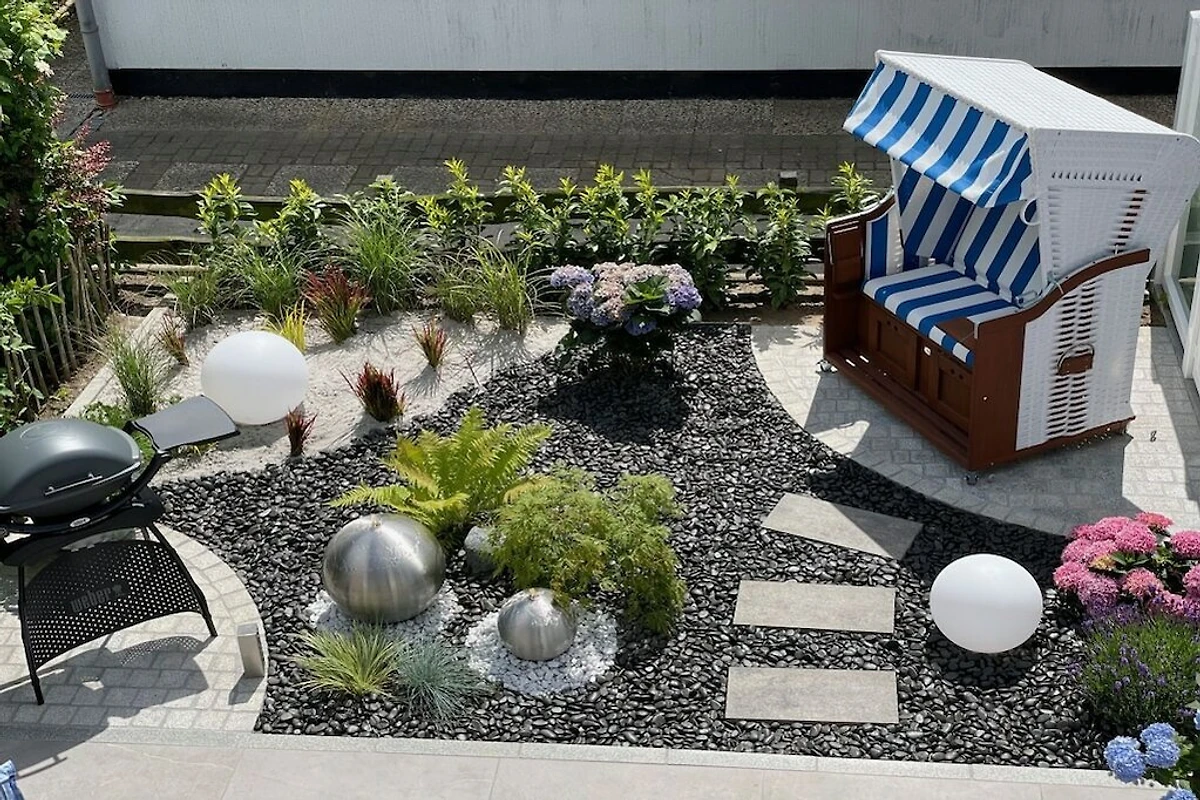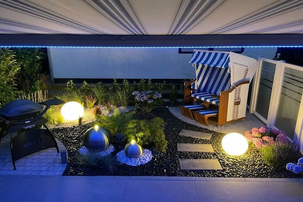 In onze "DESIGN-tuin", met ons terras van 20 vierkante meter, ervaart u pure ontspanning met het harmonieuze geluid van de waterpartij in een heel bijzondere sfeer... .