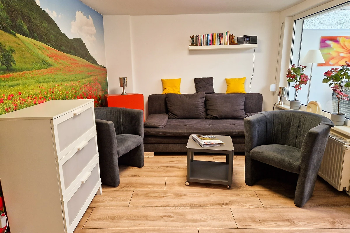 * Woonkamer met tv, radio & uitschuifbare slaapbank