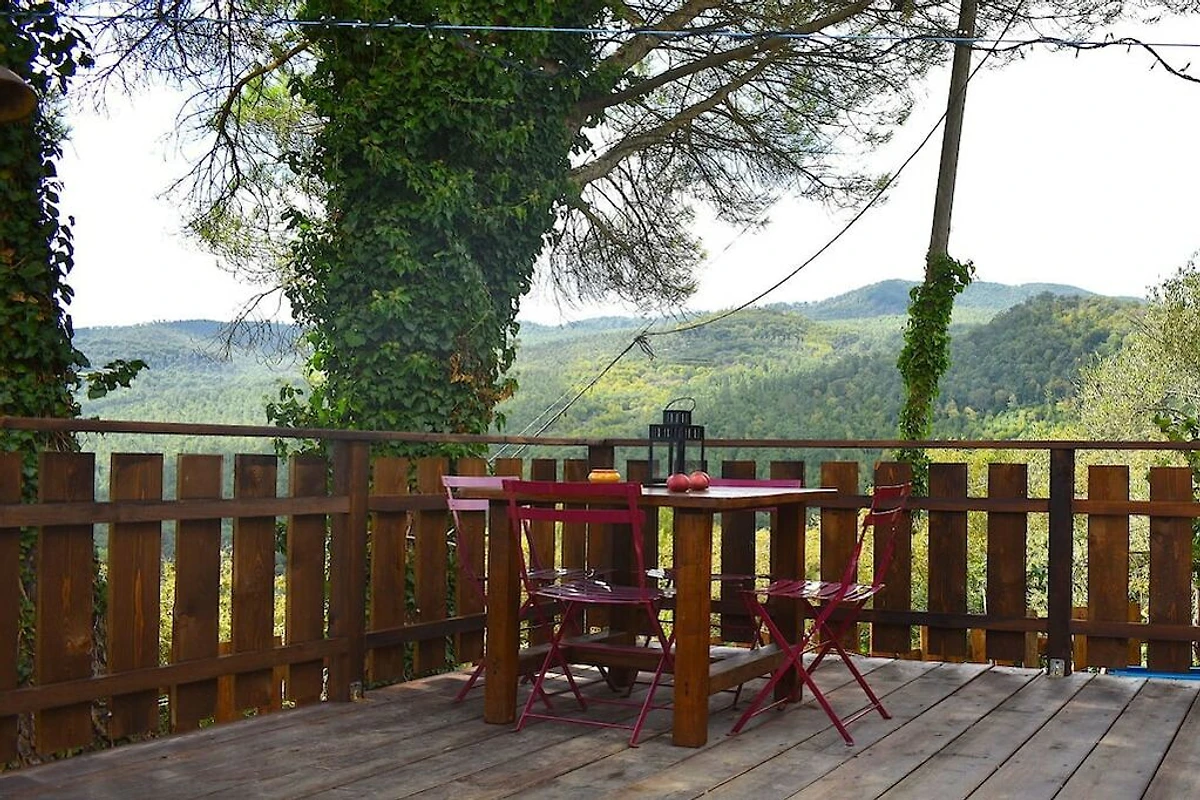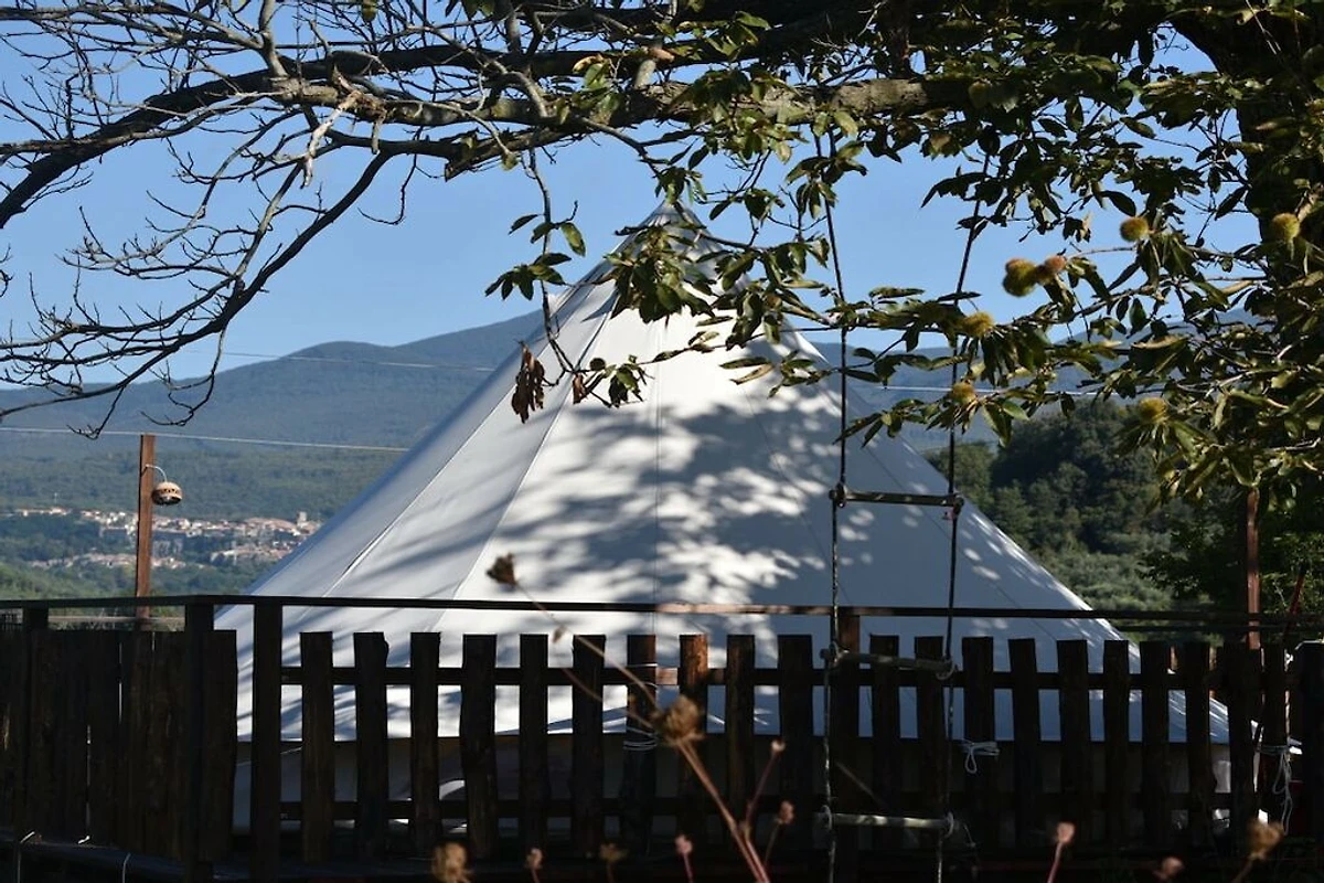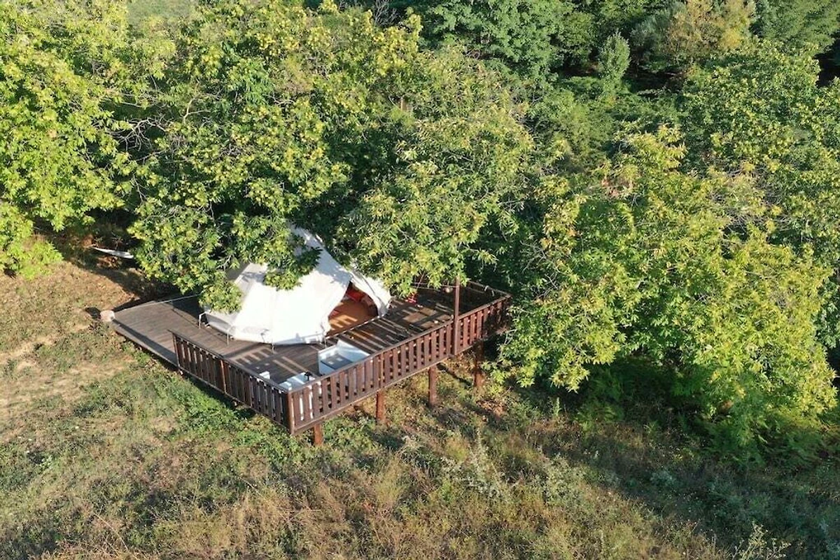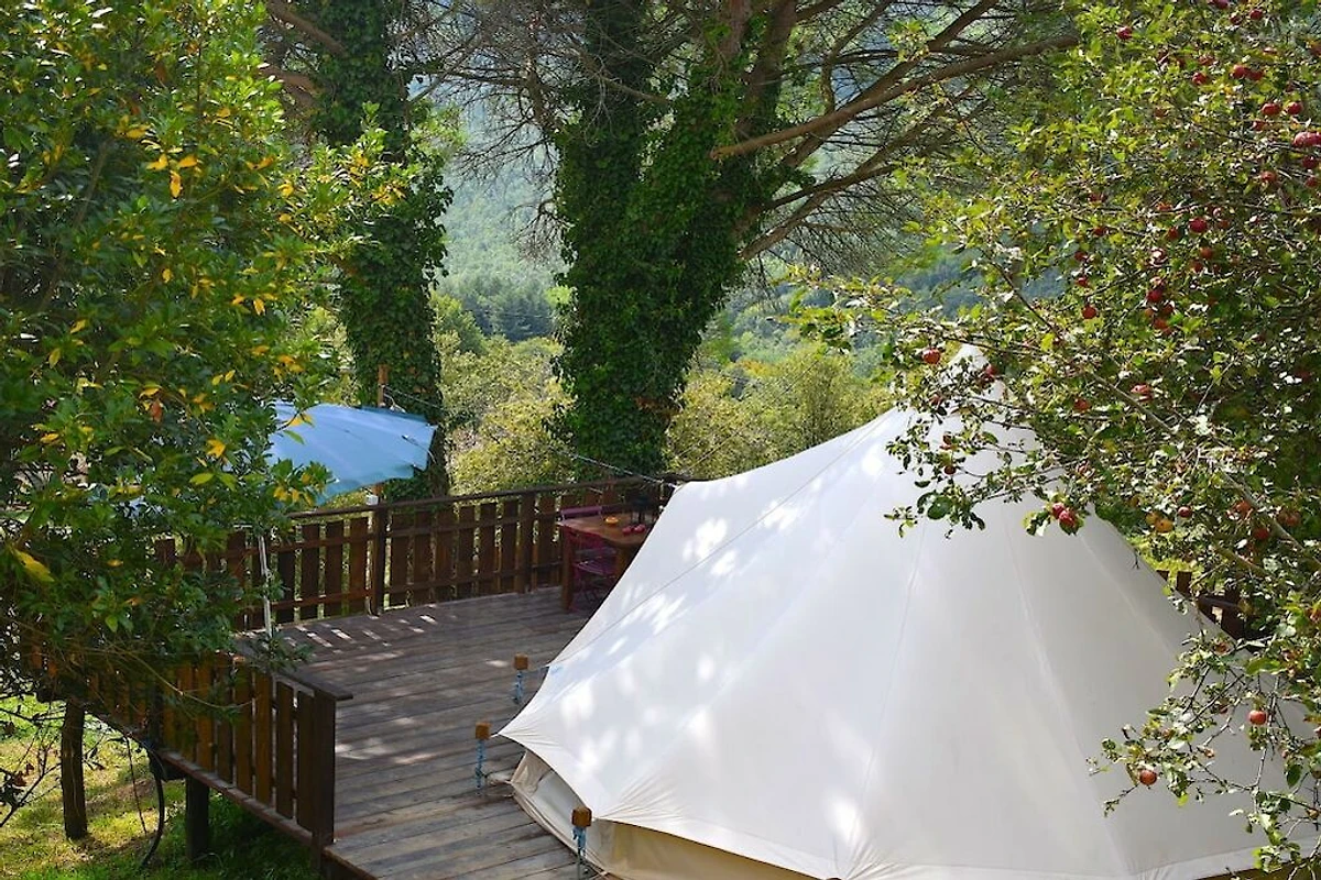 De tent staat op een groot houten terras in de schaduw van eeuwenoude kastanjebomen en biedt maximale privacy.