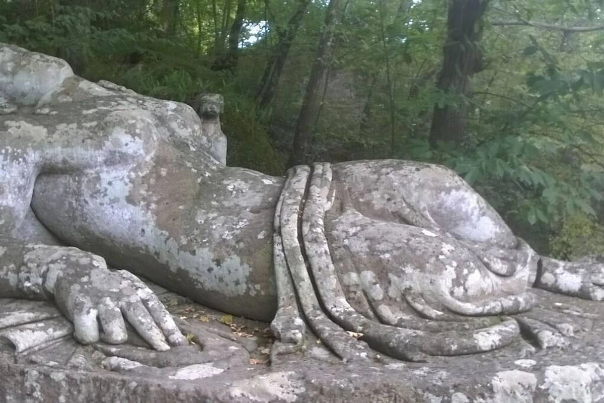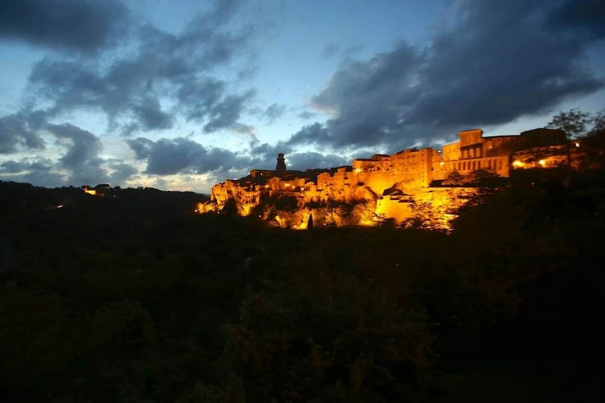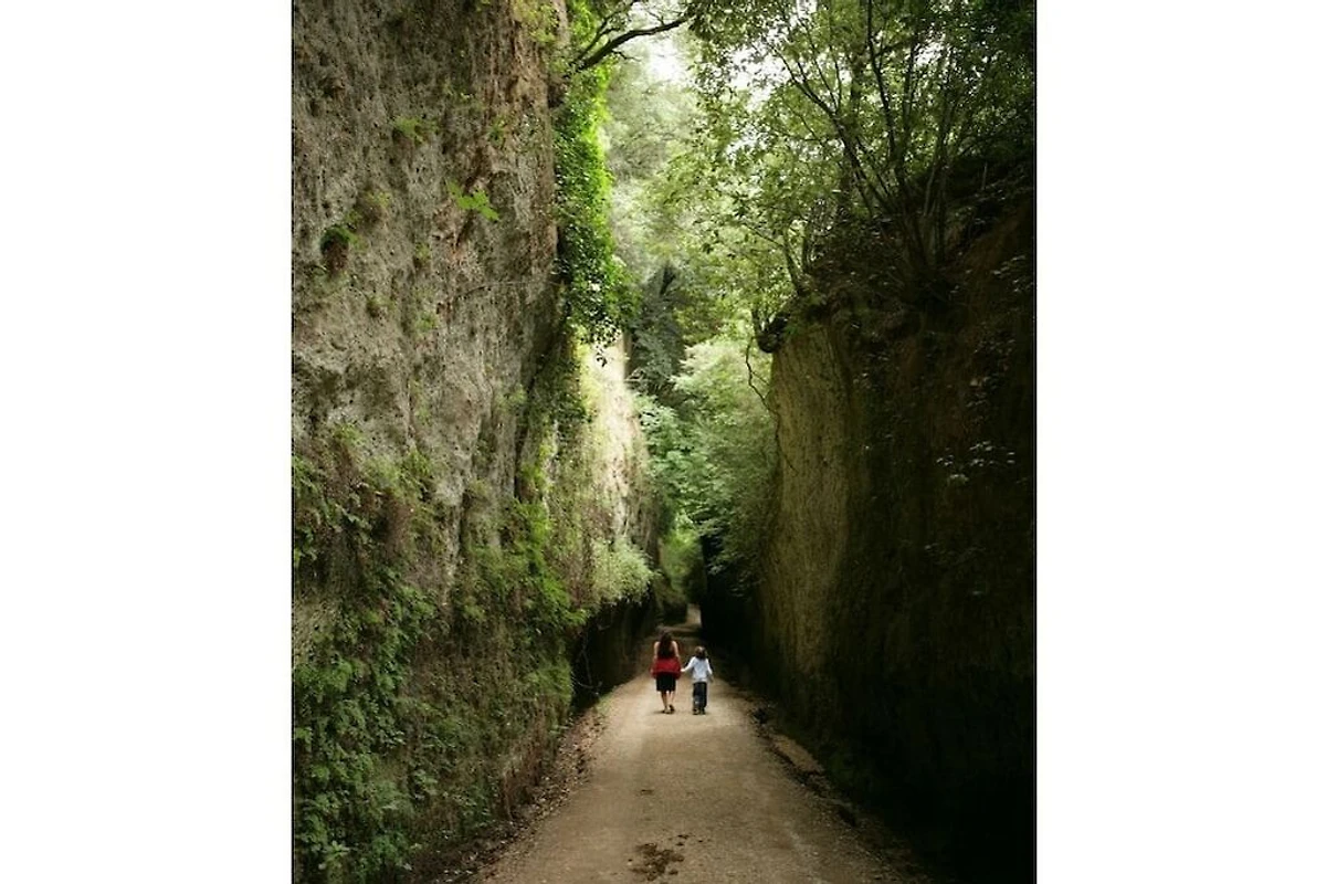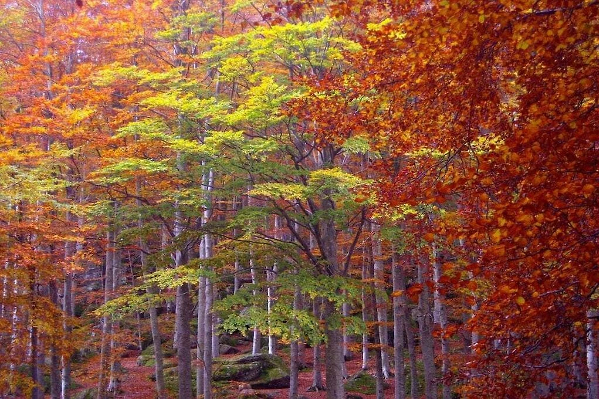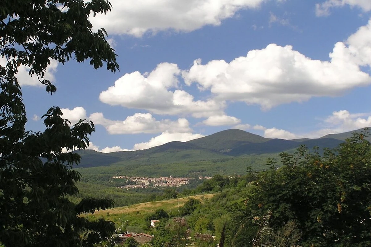 De tent staat op een groot houten terras in de schaduw van eeuwenoude kastanjebomen en biedt maximale privacy.