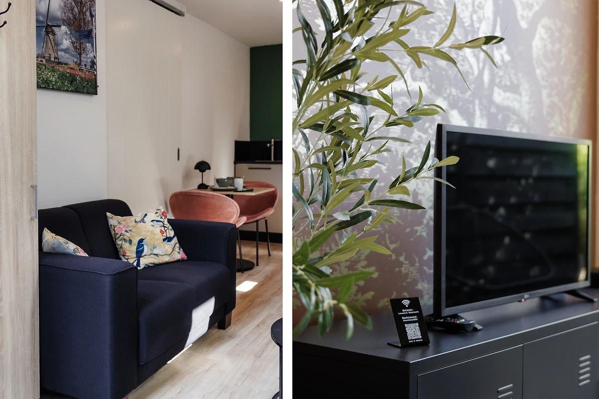 Ontdek de perfecte uitweg in het Bed and Breakfast "Unterkunft Ferien auf dem Bauernhof" in Haastrecht, ideaal voor twee gasten. Deze charmante accommodatie biedt op 20 vierkante meter een gezellig slaapkamer, een modern uitgeruste badkamer en een stijlvolle woonkeuken. De kitchenette is volledig uitgerust met magnetron, waterkoker en koffiemachine, waardoor u op elk moment kunt genieten van een warme maaltijd of een verse koffie. Voor comfort zorgen de airconditioning en een zorgvuldige selectie van beddengoed, die een allergenarme omgeving garanderen. Een tv-toestel is eveneens beschikbaar, ideaal voor ontspannen avonden. De woonkamer, ingericht met comfortabele sofa’s en stijlvolle decoratie-elementen, nodigt uit om te blijven.