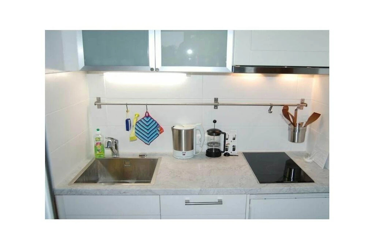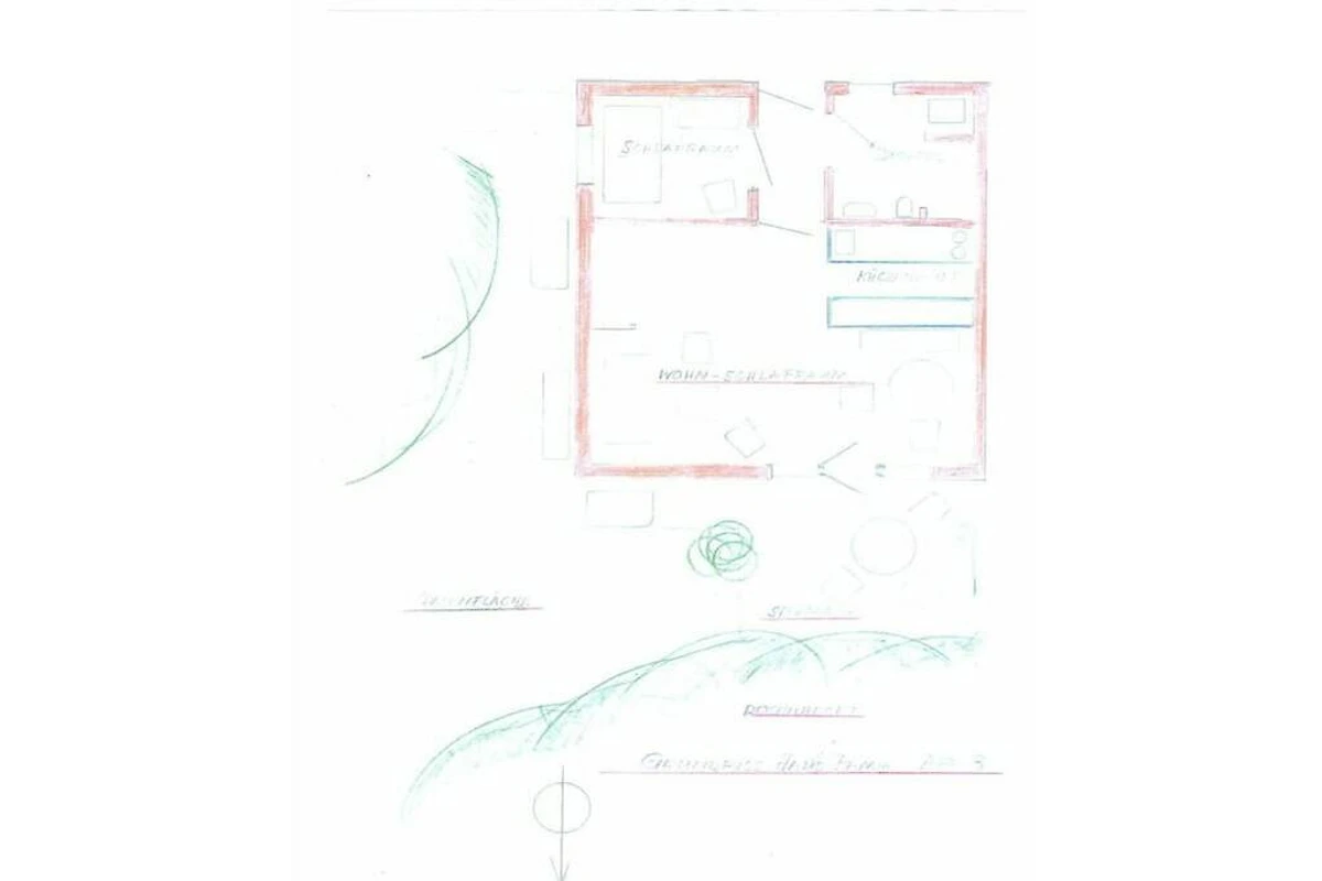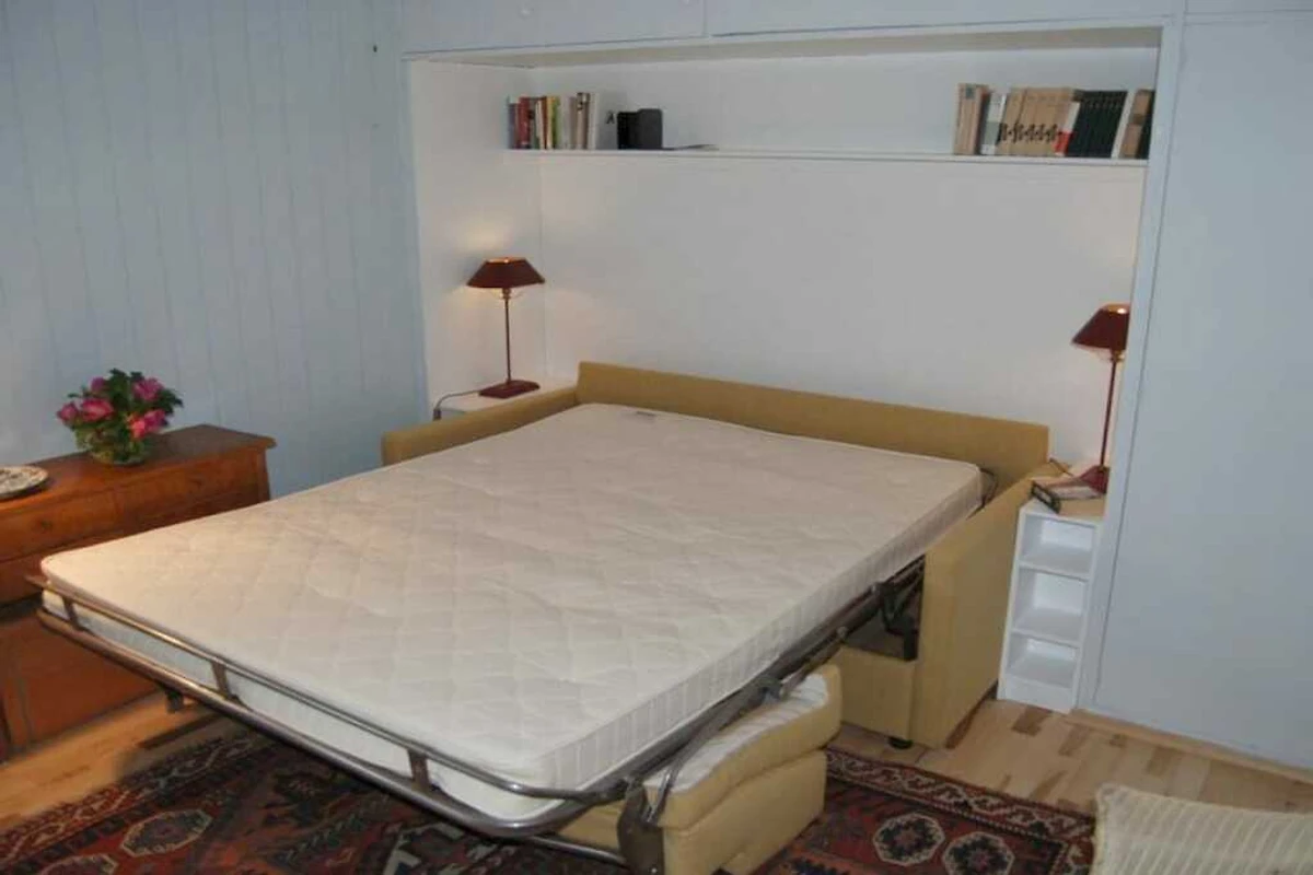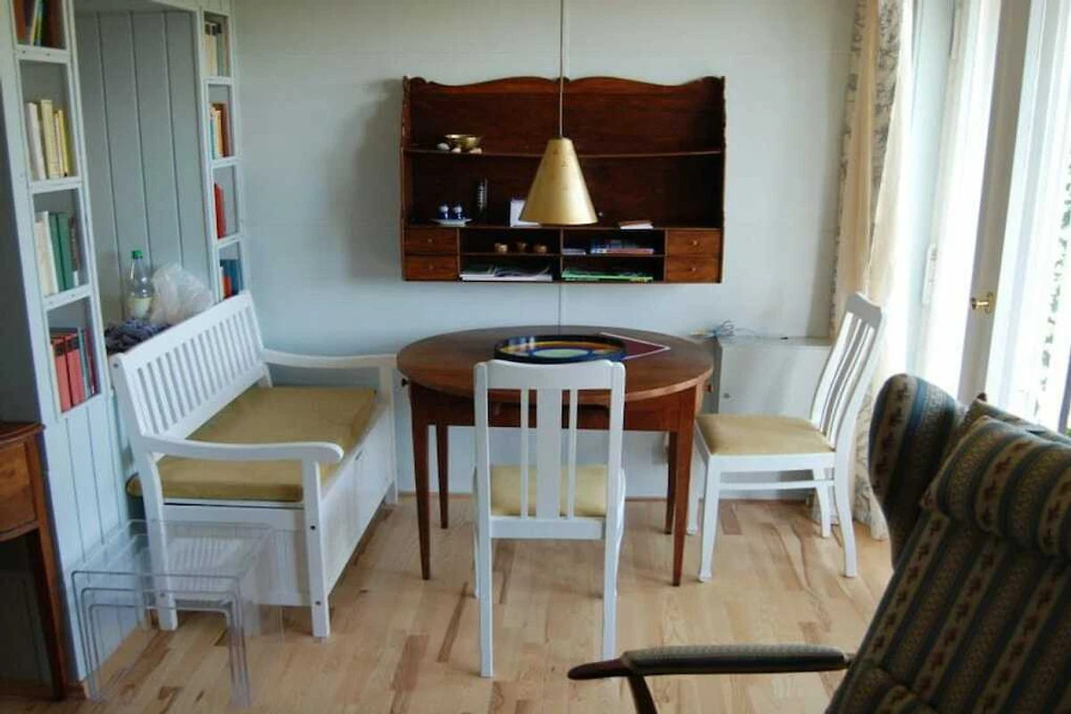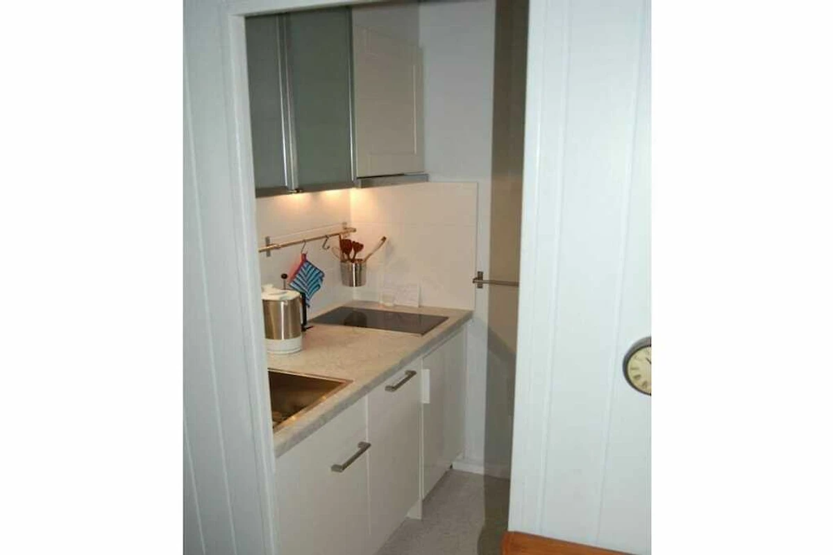 Parterre: (hal(), open keuken(eettafel, waterkoker, fornuis, koffiezetapparaat, magnetron, afwasmachine, koelkast), woon/slaapkamer(, , bibliotheek, 1-pers. slaapbank, TV, radio, stereo-installatie), kinderslaapkamer(2-pers. bed), badkamer(, toilet, douche, wastafel))
