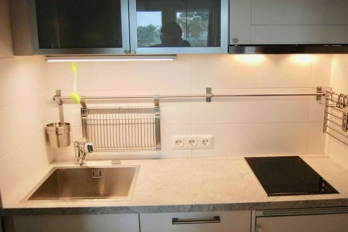 U vindt er een vrolijk gekleurde woon-/eet-/slaapkamer met internetaansluiting, een slaapbank, een wandmeubel, een eethoek, een zithoek en een kitchenette. Deze is voorzien van een koel-/vriescombinatie, een vaatwasser en een keramische kookplaat.