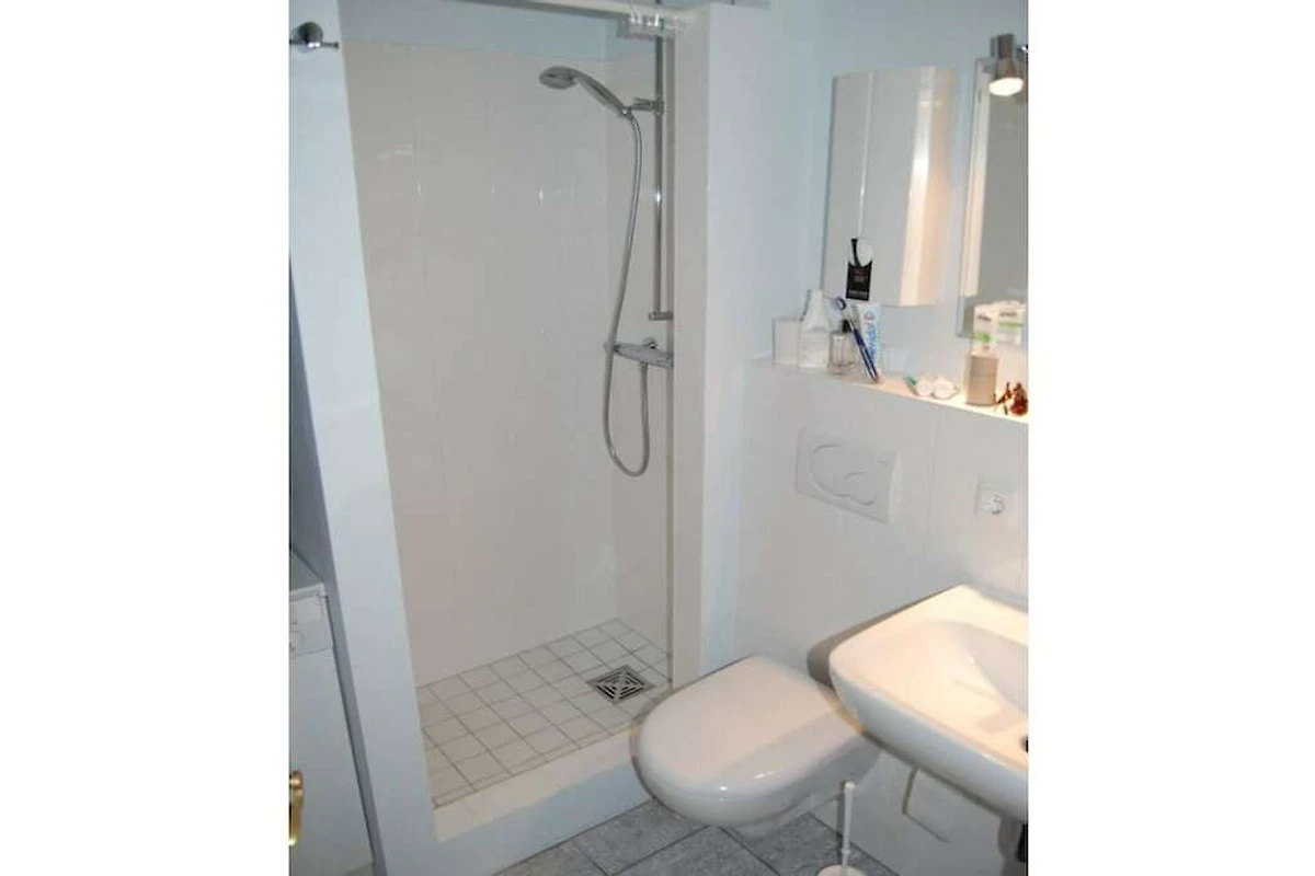 De slaapkamer is ingericht met een bed en een ladekast. De badkamer met douche maakt het geheel compleet.