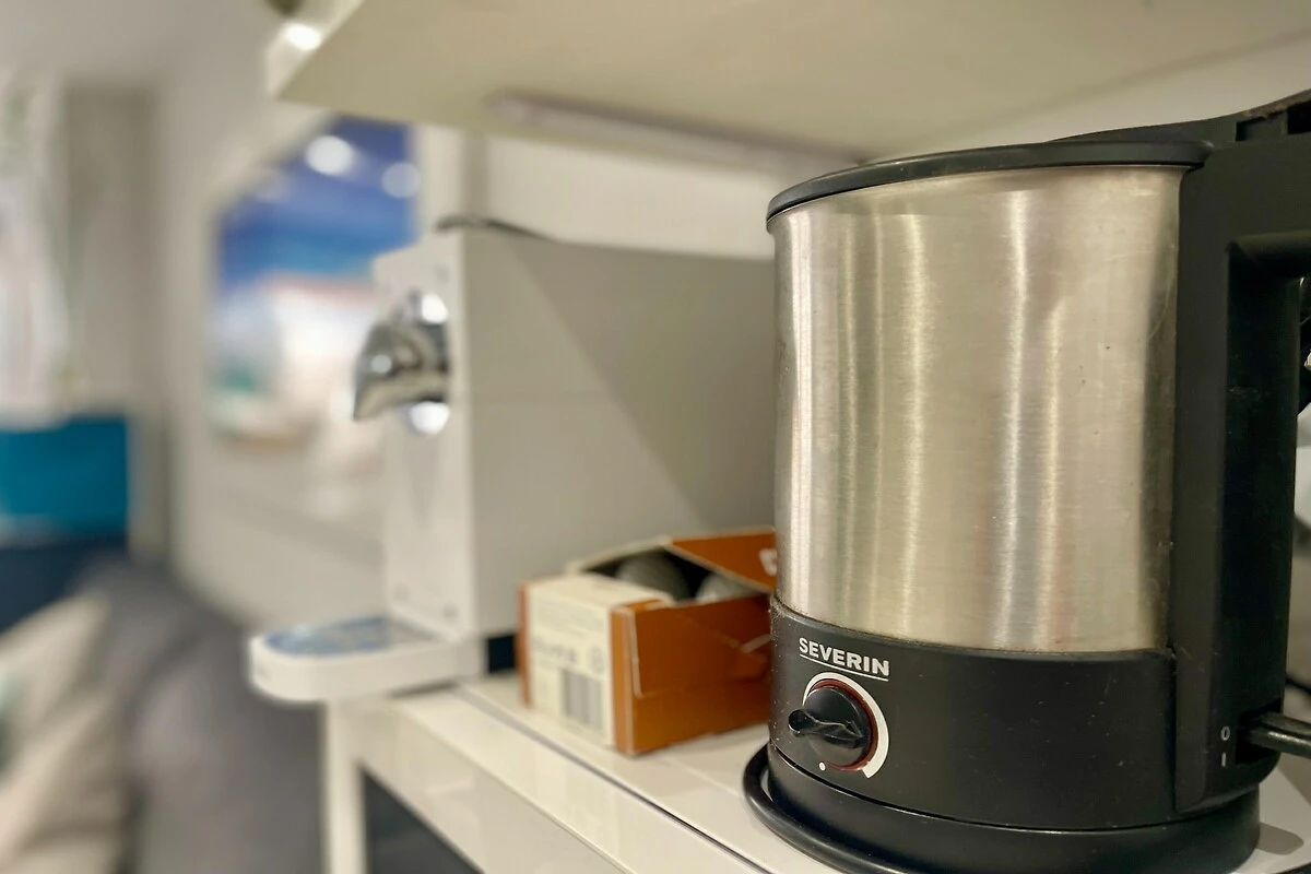 Op de 1e etage: (ingang, open keuken(kookplaat, broodrooster, afzuigkap, koffiezetapparaat, magnetron, koel-/vriescombinatie), woon/eetkamer(1-pers. slaapbank, 1-pers. kastbed(90 x 190 cm), TV(flatscreen), zithoek), slaapkamer(2-pers. bed(135 x 190 cm)), badkamer(douche, wastafel, toilet, wasmachine), airconditioning(mobiel), )