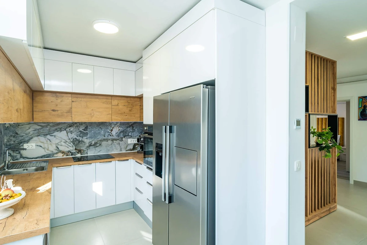 De open keuken, met gasfornuis, is uitgerust met koelkast, magnetron, oven, vriezer, vaatwasmachine, servies/bestek, keukengerei, koffiezetapparaat en broodrooster.
