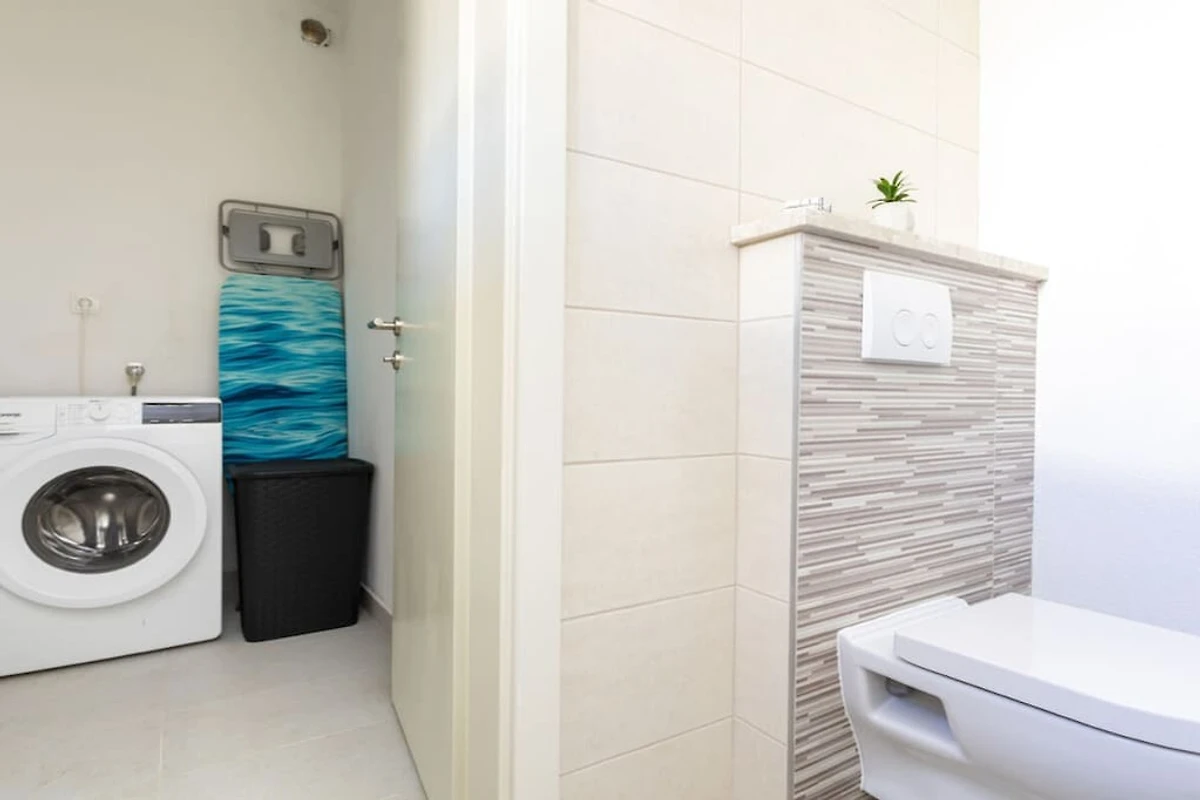 Parterre: (woonkamer(1-pers. slaapbank, TV, open haard, airconditioning), eetkamer(eettafel, airconditioning), guest toilet(, , toilet, wastafel, wasmachine, verwarming, haardroger), drying room(, , toilet, wastafel, wasmachine, strijkplank, haardroger))