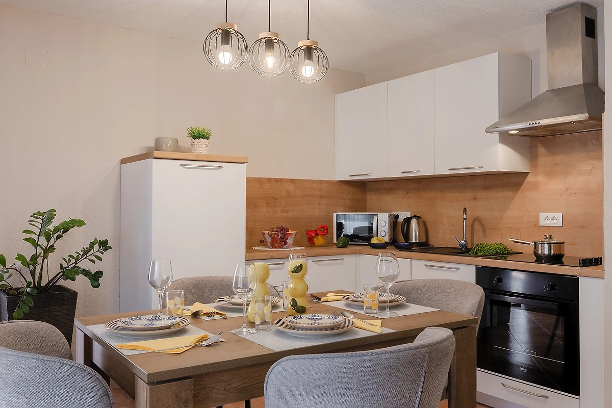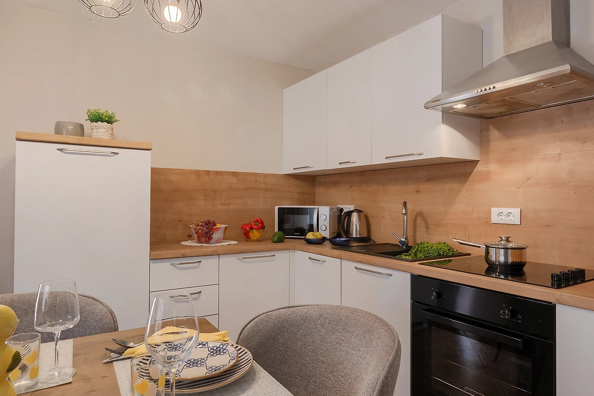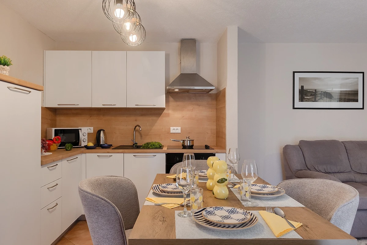 De open keuken, met inductie kookplaat, is uitgerust met koelkast, magnetron, oven, vriezer, vaatwasmachine, servies/bestek, keukengerei, koffiezetapparaat en broodrooster.