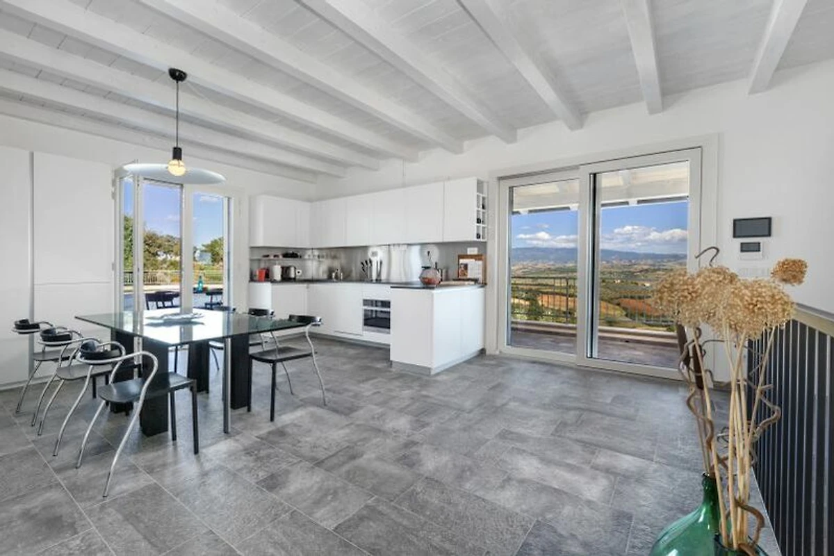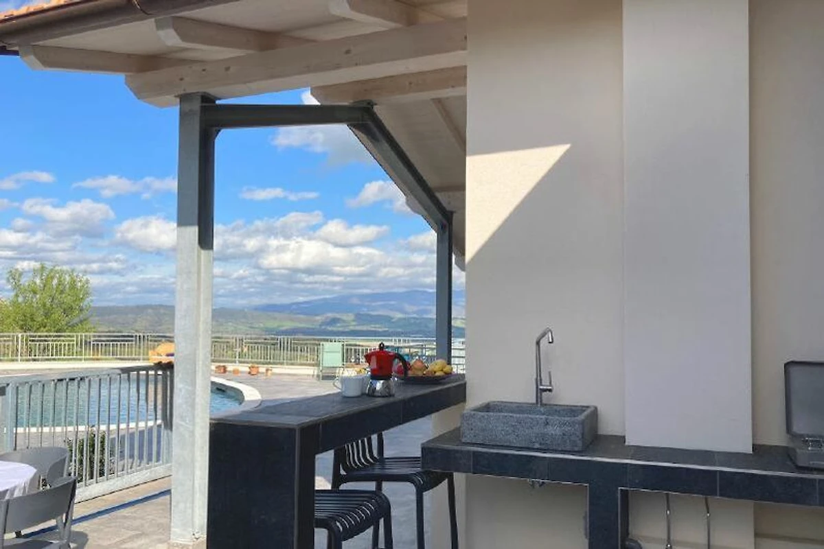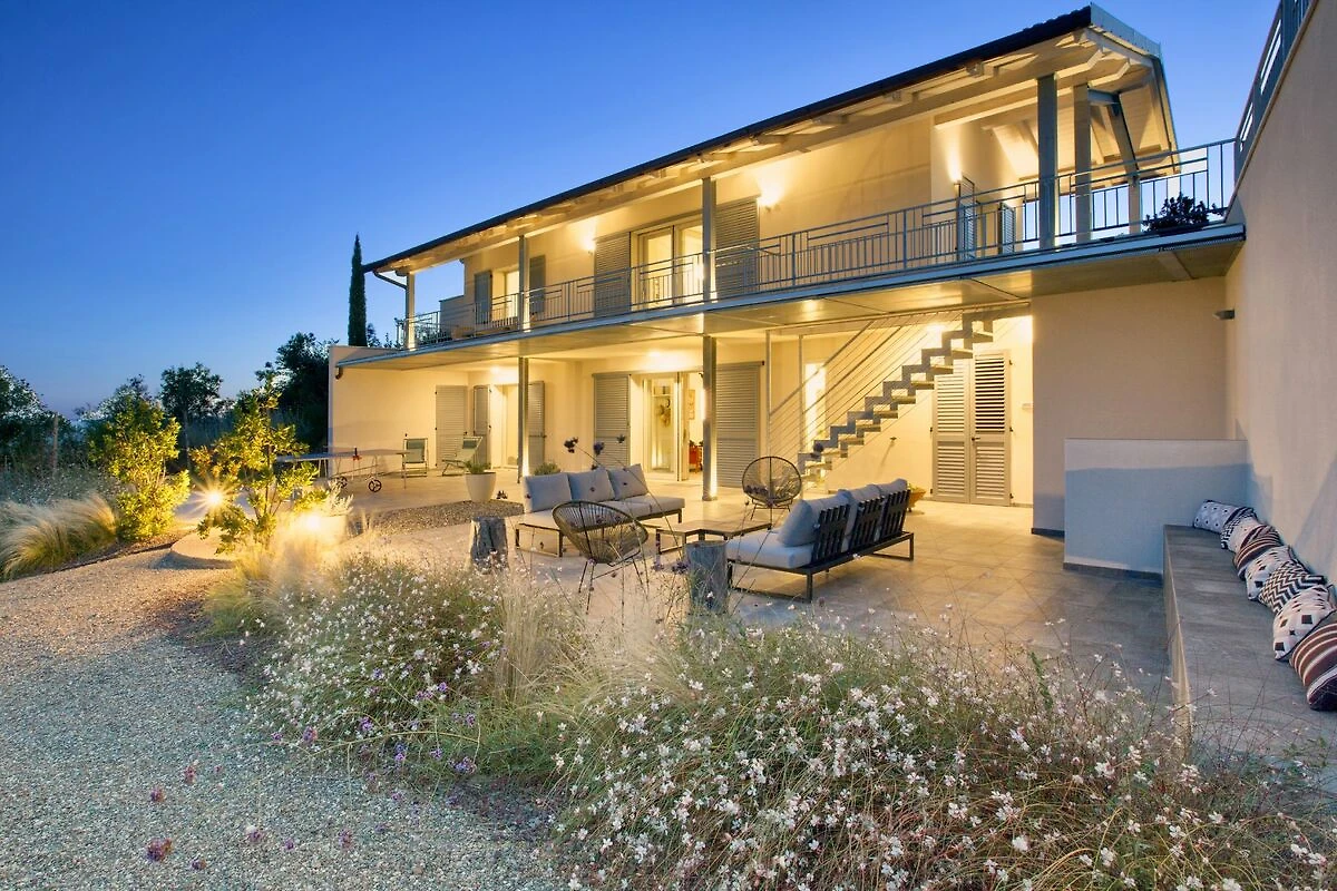 De villa bevindt zich op de top van een heuvel met panoramisch uitzicht op het Toscaanse landschap, te midden van een 4 ha groot, omheind terrein met olijfgaard en een klein bos, evenals het huis van de eigenaars, dat door hen het hele jaar door wordt bewoond. De villa is in modern design gebouwd met de bedoeling de aandacht te vestigen op de schoonheid van de natuur waarmee ze omgeven is. En dit is perfect gelukt!