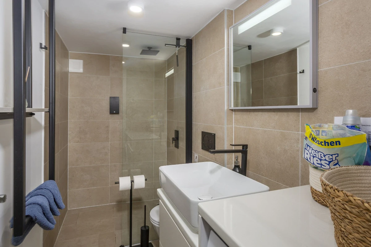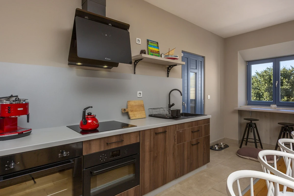 De open keuken, met inductie kookplaat, is uitgerust met koelkast, magnetron, oven, vriezer, vaatwasmachine, servies/bestek, keukengerei, koffiezetapparaat en broodrooster.