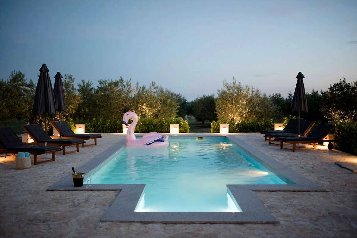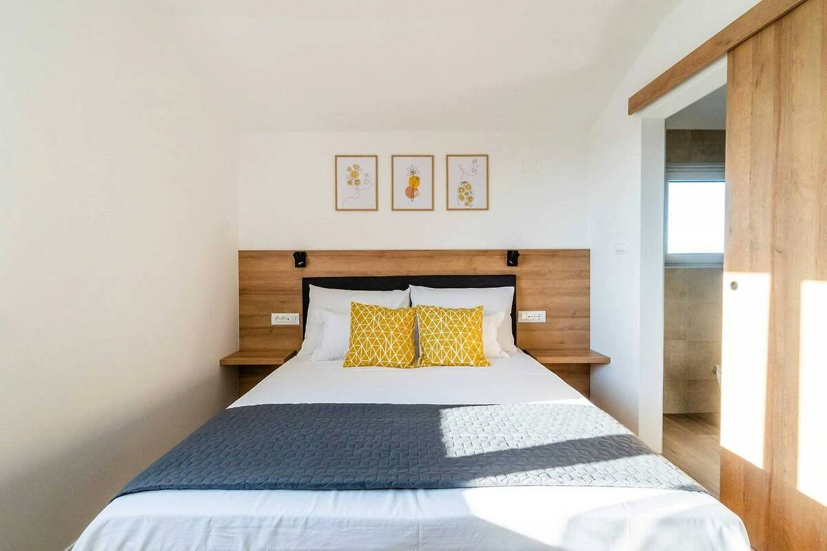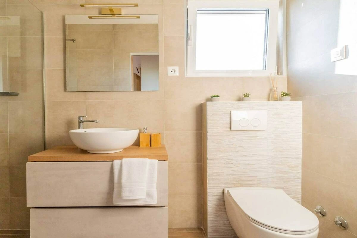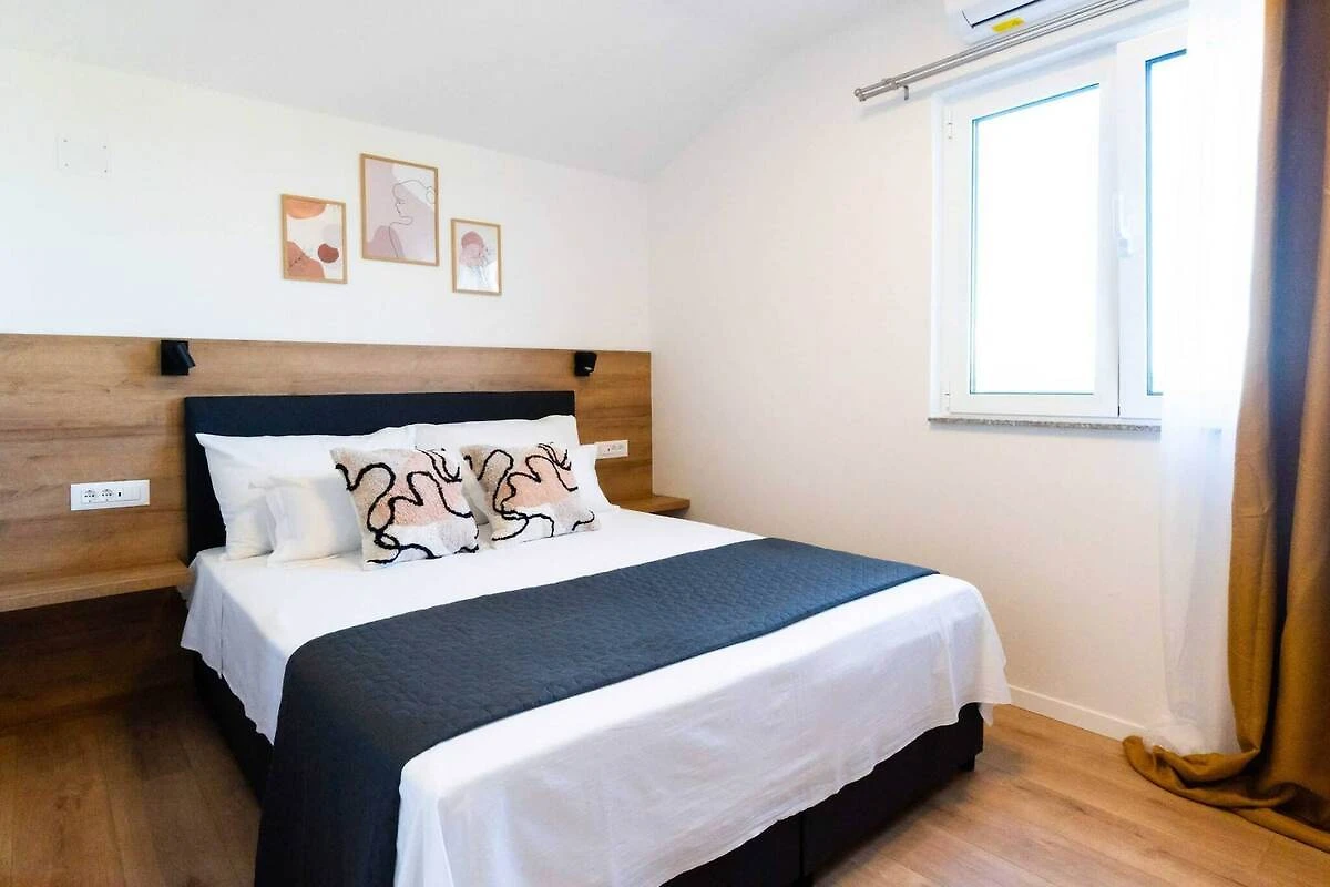 Stap binnen in een serene oase, verscholen in de olijfboomgaarden achter Vodice, waar de tijd langzamer gaat en de natuur centraal staat. Voor de deur staat een prachtig gebouwde villa van ongeveer 150 m² met twee verdiepingen, ontworpen voor comfort en gezelligheid. Boven vindt u drie slaapkamers met airconditioning, elk met een eigen badkamer en tv — perfect voor twee gezinnen of een groep vrienden die zowel privacy als verbondenheid zoeken. Beneden loopt de open keuken, eetkamer en woonkamer over in een overdekt terras met een stenen barbecue, zitplaatsen voor lange maaltijden en een weids uitzicht over het privézwembad (9 × 4 m) en de uitgestrekte tuin.