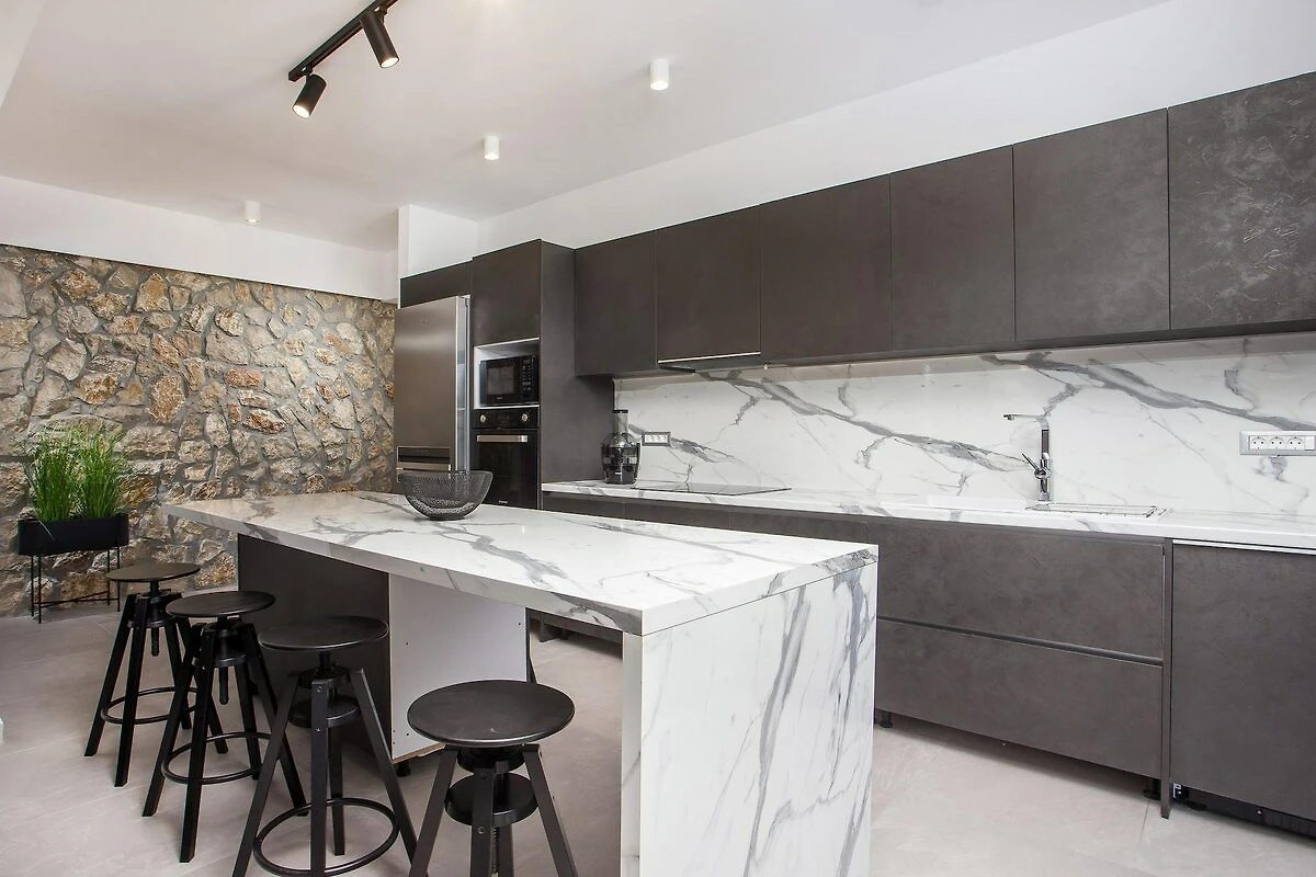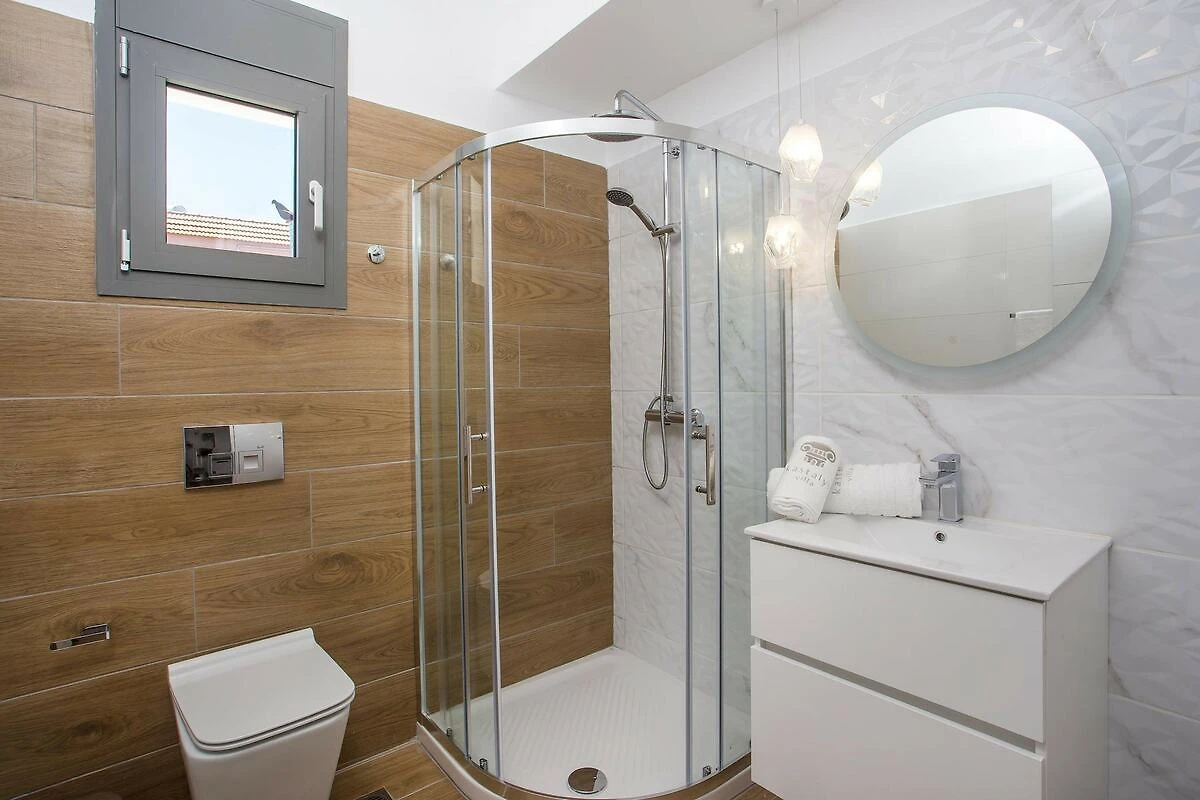 Binnen is de villa ontworpen voor comfort en stijl. De villa beschikt over vier prachtig ingerichte slaapkamers, elk met een eigen badkamer, en biedt plaats aan maximaal acht gasten. Alle kamers zijn voorzien van moderne boxspringbedden, hoogwaardig linnengoed, verduisterende rolgordijnen en airconditioning voor een rustgevende nachtrust. De open woonkamer straalt een lichte, gastvrije sfeer uit met een chique inrichting en een grote gebogen smart-tv met internationale zenders – perfect voor gezellige avonden. De volledig uitgeruste keuken biedt alles wat u nodig heeft voor een zorgeloze maaltijd, inclusief een vaatwasser, wasmachine, oven, koffiezetapparaat en meer.