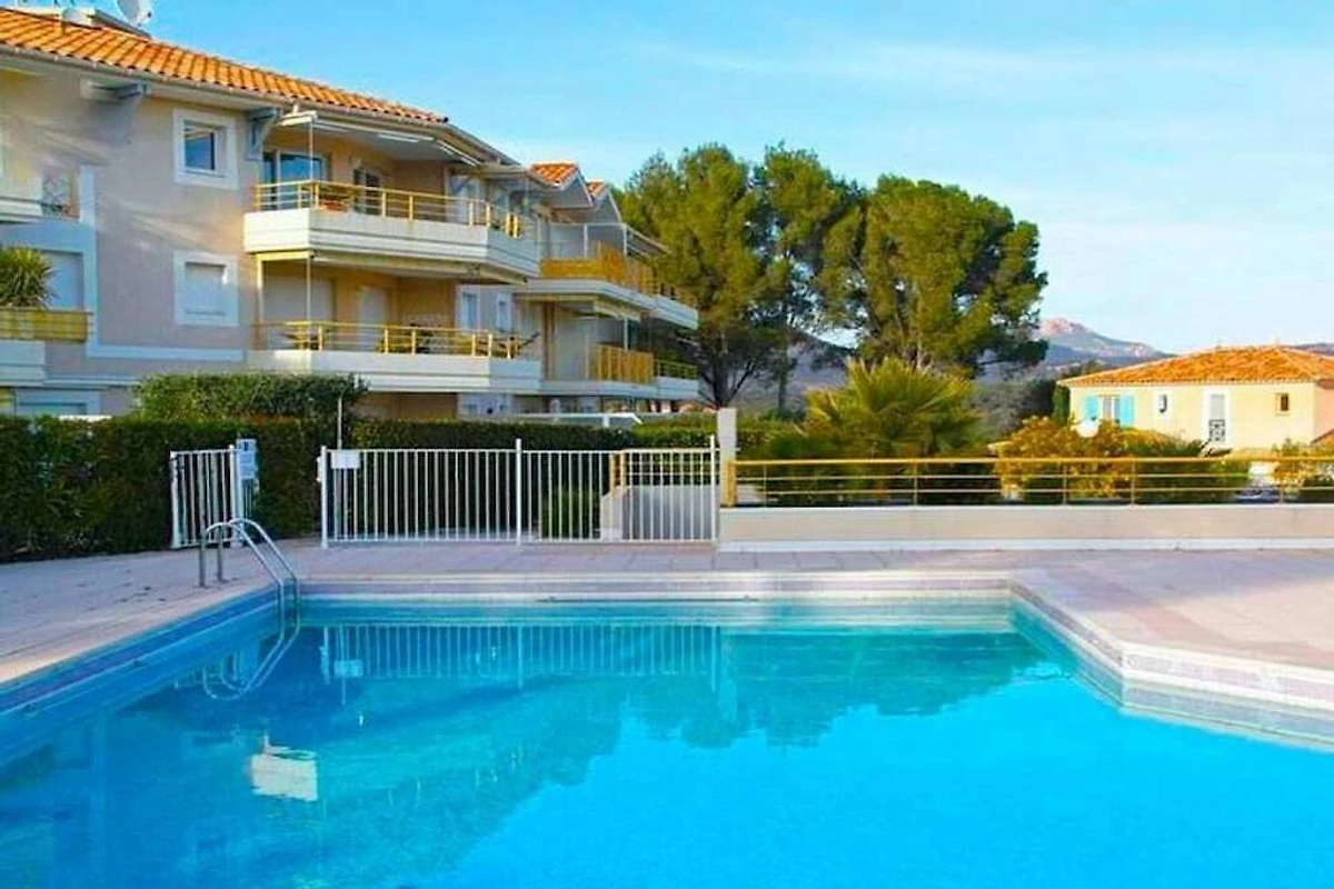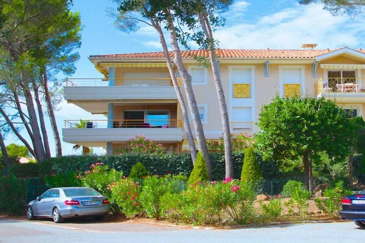 Het gemeenschappelijke zwembad van het appartement bevindt zich achter het gebouw.