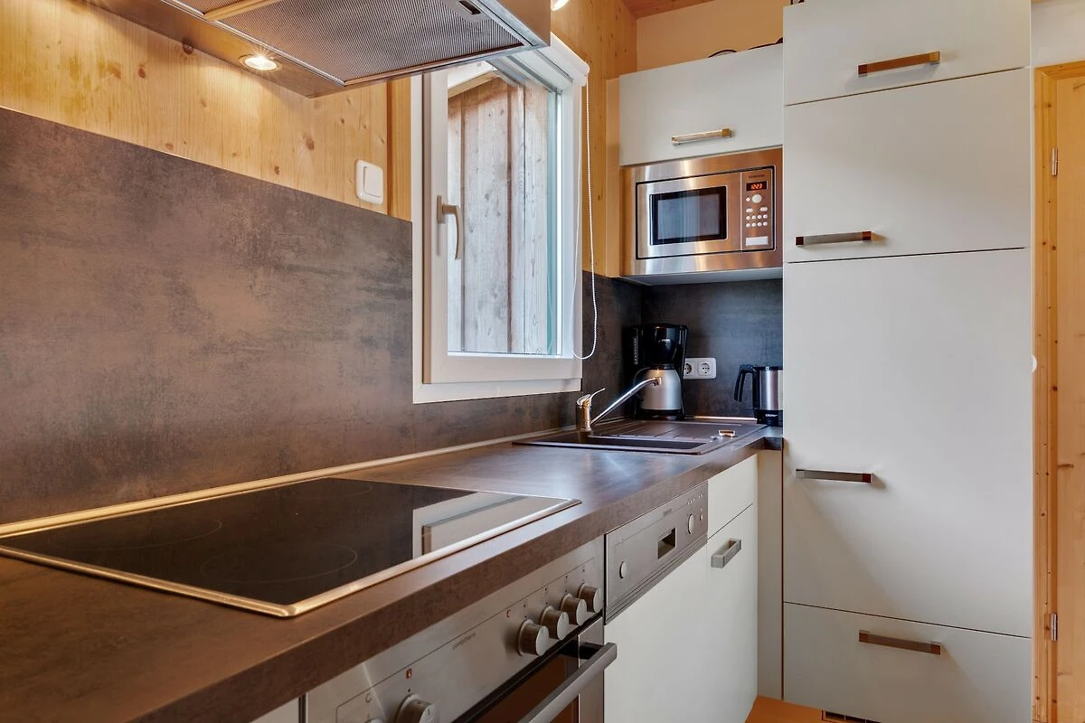 Voor een comfortabel en zelfvoorzienend verblijf beschikt het chalet over een volledig uitgeruste open keuken met moderne apparatuur, waaronder een fornuis, oven en koelkast. De uitnodigende woonkamer is ideaal om te ontspannen na een actieve dag, terwijl het terras een heerlijke plek biedt om de frisse berglucht in te ademen.
