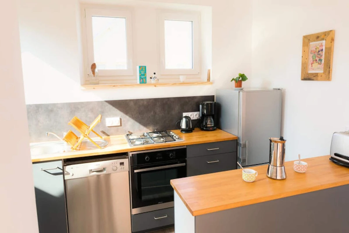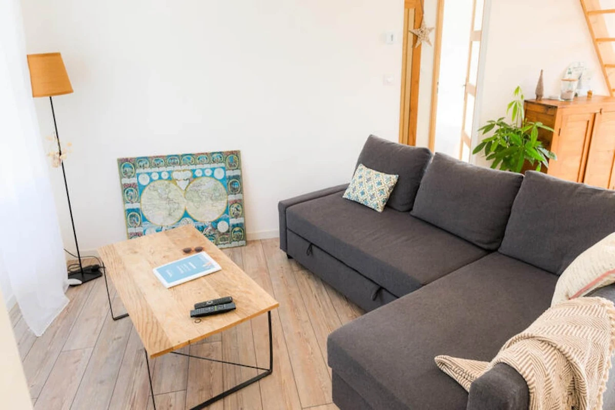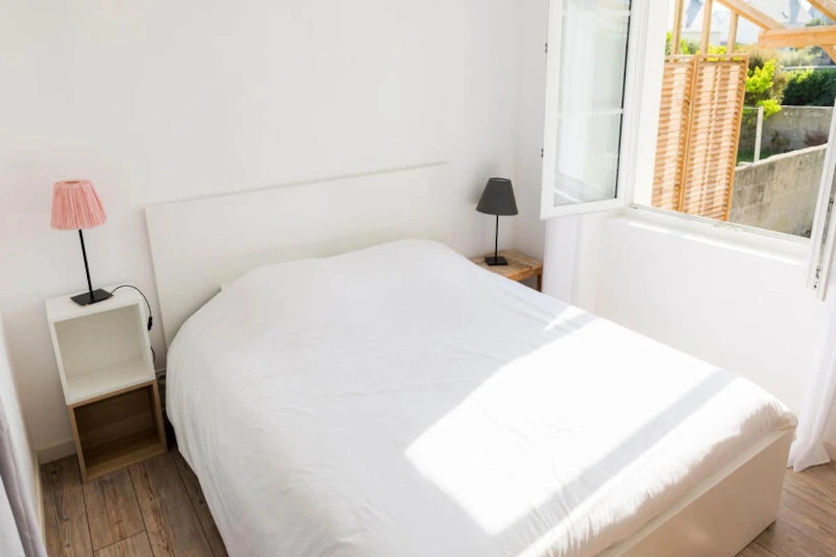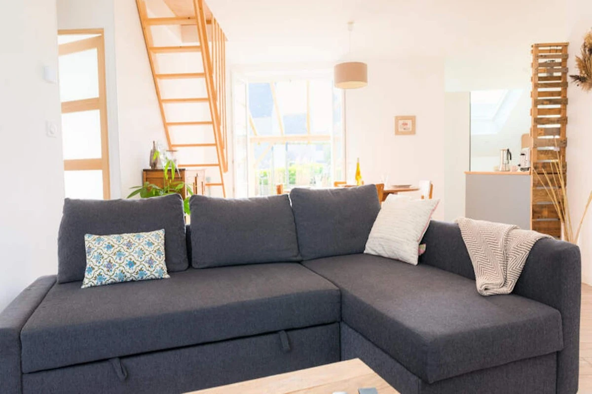 In het hart van Bretagne biedt dit heerlijke gelijkvloerse familiehuis een serene oase op slechts een steenworp afstand van het goudgele zand van Plage de la Joie en de charmante haven van St. Guénolé. Stelt u zich eens voor: wakker worden met de frisse zeebries, uw dagen doorbrengen met het verkennen van de ruige kustlijn en eindigen met een rustige avond op uw privéterras onder de Bretonse hemel. Deze woning is een oase van ontspanning en ontdekking, perfect gelegen om uzelf onder te dompelen in de schoonheid en cultuur van Penmarch. Binnen is het huis licht en gastvrij, met twee gezellige slaapkamers, een moderne badkamer met een haardroger en een ruime woonkamer, ontworpen voor comfort. De open keuken is volledig uitgerust met alles wat u nodig heeft, van een koelkast en oven tot een vaatwasser en een koffiezetapparaat, waardoor u gemakkelijk heerlijke maaltijden kunt bereiden met lokale ingrediënten. Extra voorzieningen zijn onder andere wifi, een televisie en een wasruimte met een wasmachine, strijkplank en droogrek. \n\nStap buiten in een omheinde tuin op het zuiden met een terras van 30 m², ingericht met tuinmeubilair en een barbecue, perfect om buiten te dineren of gewoon te genieten van de rustige sfeer. De locatie is ideaal voor gezinnen, met het strand op slechts 250 meter afstand, een bakker op 550 meter afstand en diverse restaurants en winkels op loopafstand. Voor wie op zoek is naar avontuur, biedt de omgeving mogelijkheden om te surfen bij Pors Carn of La Torche, een bezoek te brengen aan de iconische vuurtoren van Eckmühl en schilderachtige tochten langs de Route du Vent Solaire. \n\nOf u nu de nabijgelegen steden Concarneau en Quimper verkent, ontspant op het zandstrand of geniet van de lokale keuken, deze charmante vakantiewoning belooft een onvergetelijke vakantie in Bretagne. Met een conciërgeservice gedurende uw hele verblijf en huisdiervriendelijke accommodaties is aan elk detail gedacht om een onvergetelijke ervaring te garanderen.