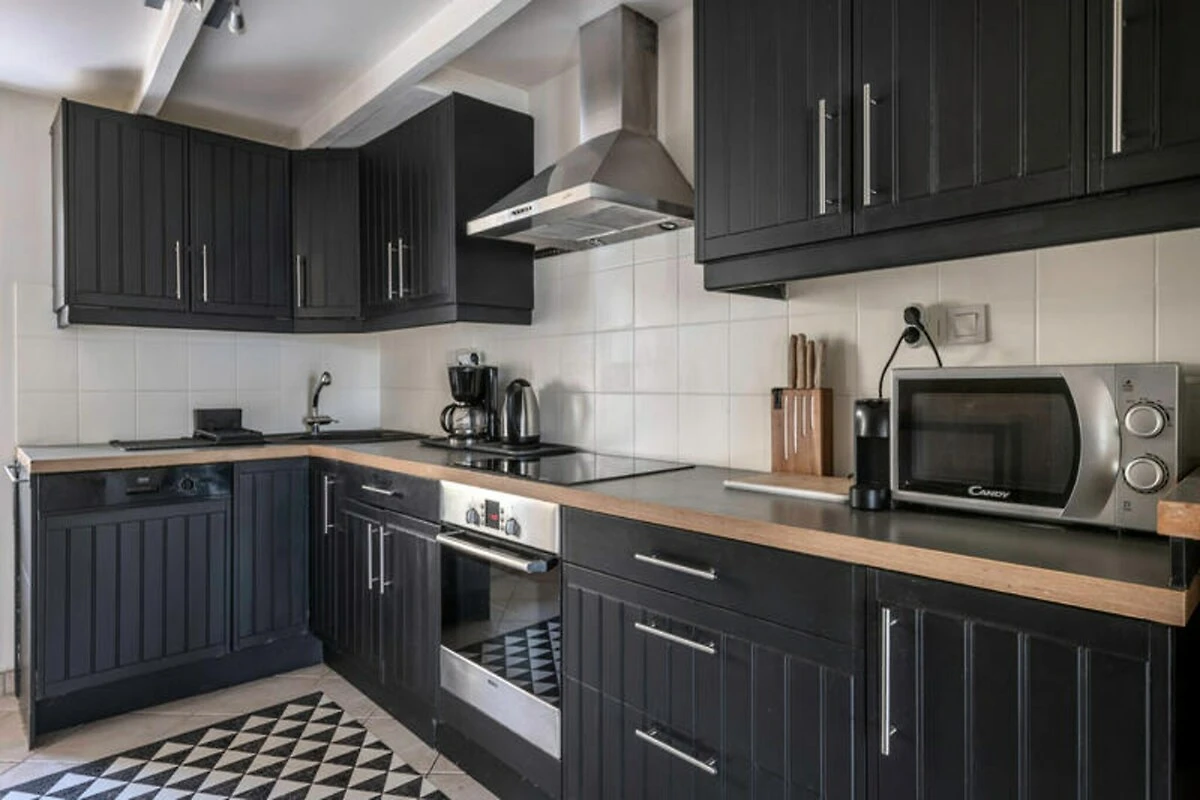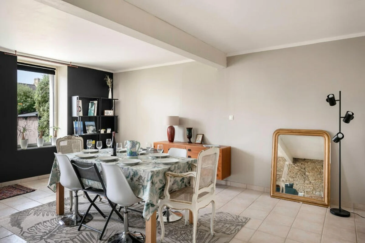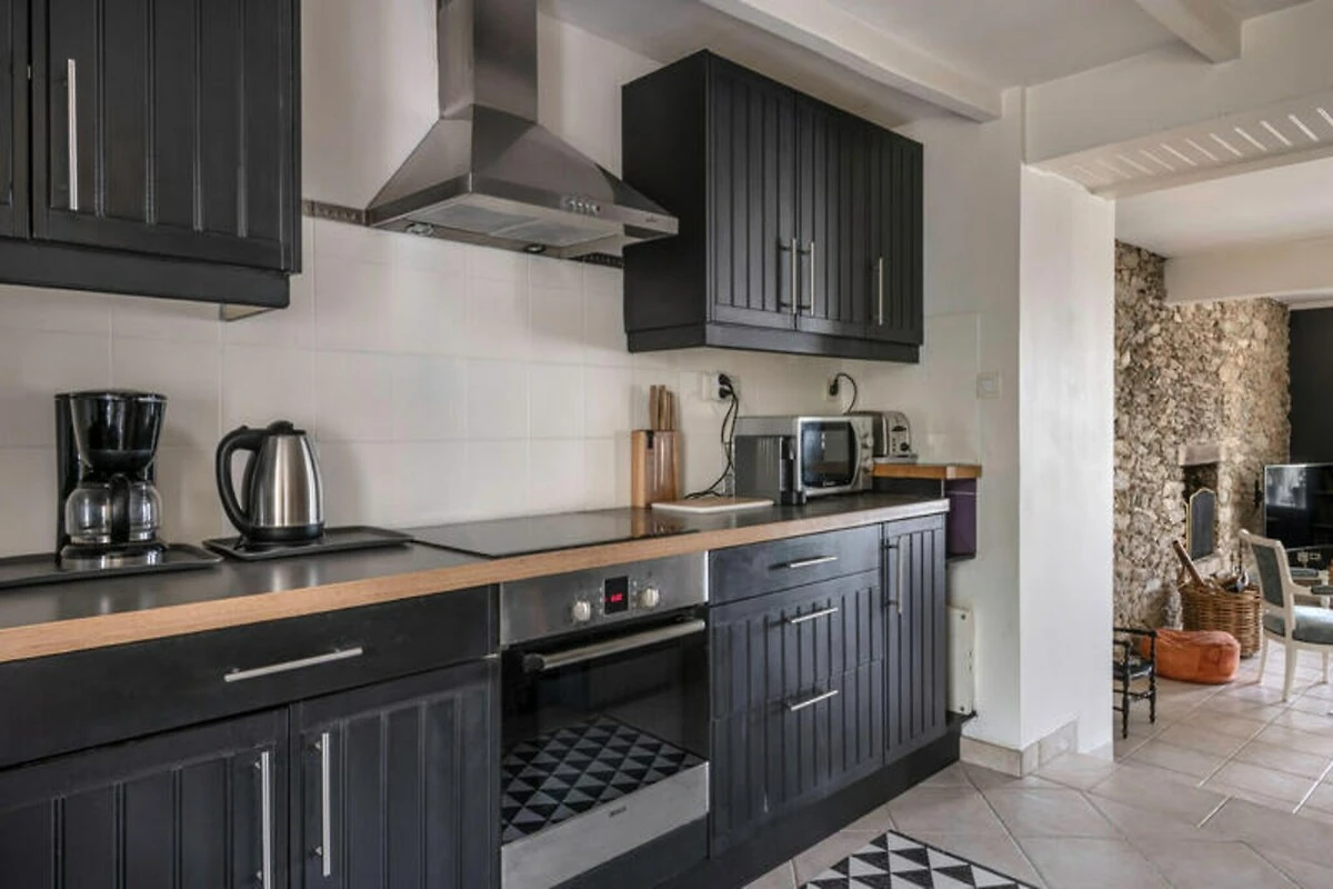 Binnen beschikt het huis over drie comfortabele slaapkamers, een volledig uitgeruste aparte keuken met moderne apparatuur zoals een inductiekookplaat, Nespresso-apparaat en vaatwasser, evenals handige voorzieningen zoals wifi, een televisie en een wasmachine. De uitnodigende woonkamer, compleet met een open haard, biedt de perfecte setting voor gezellige avonden na een dag vol ontdekkingen. Een parkeerplaats buiten zorgt voor gemak tijdens uw verblijf.