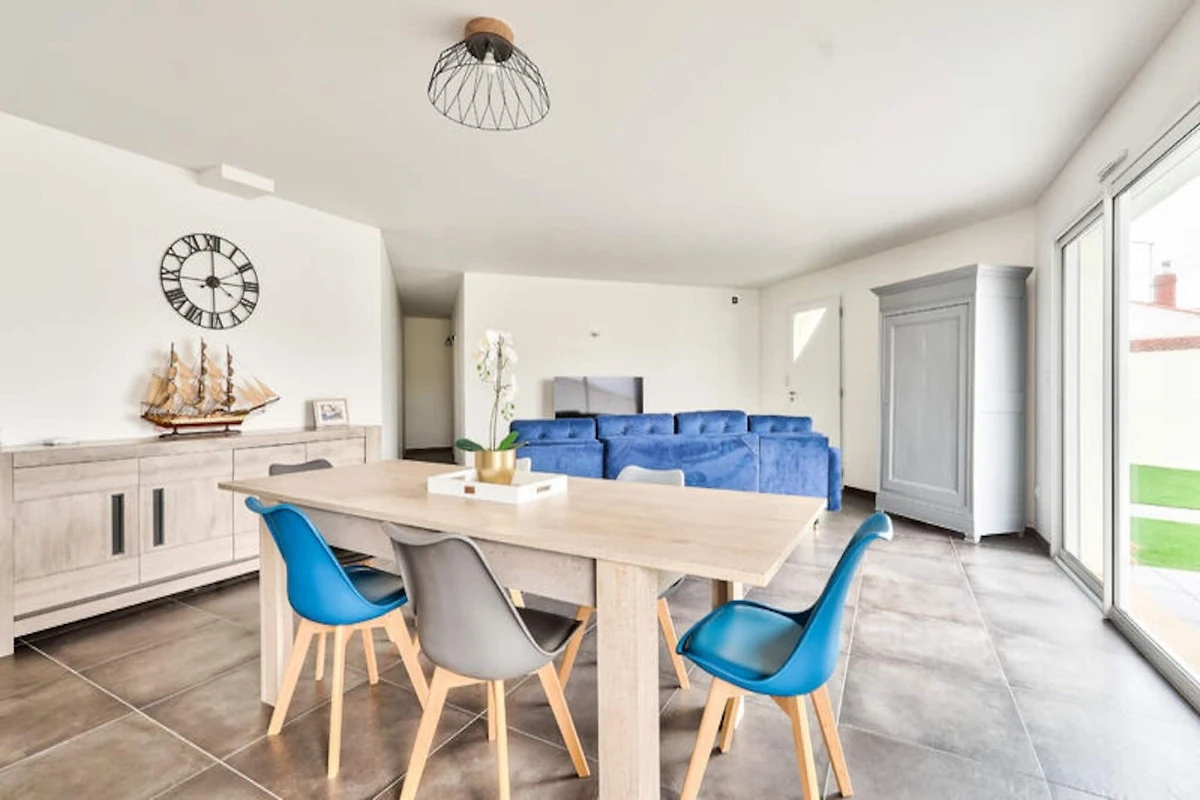 Een zachte zeebries en het geluid van de golven bepalen de sfeer van uw verblijf in dit charmante toevluchtsoord aan de kust, op slechts 250 meter van de zandstranden van La Tranche-sur-Mer. Of u nu op zoek bent naar een rustige ontsnapping of een actief avontuur aan zee, dit lichte en moderne huis biedt de perfecte uitvalsbasis voor onvergetelijke momenten met familie of vrienden. Stelt u zich eens voor: u begint de dag met een kopje koffie op het terras, omringd door de weelderige tuin, of sluit hem af met een barbecue onder de sterrenhemel, genietend van verse vis en lokale wijnen.