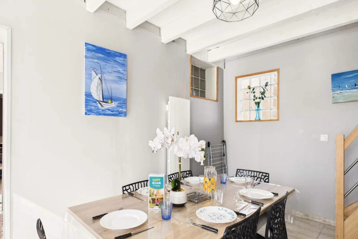 Stap binnen in een wereld van rust in dit charmante huis met felgele luiken, gelegen in het serene stadje La Tranche-sur-Mer. Perfect voor gezinnen of vriendengroepen. Dit heerlijke toevluchtsoord biedt plaats aan maximaal zeven gasten en biedt een oase van rust om te ontspannen en nieuwe energie op te doen. La Tranche-sur-Mer, bekend om zijn gezinsvriendelijke sfeer, is een badplaats met het 'Famille Plus'-label, wat garant staat voor een overvloed aan activiteiten en entertainment voor alle leeftijden. Tijdens de zomermaanden stopt er elke 15 minuten een gratis pendelbus op slechts 200 meter van het huis, die u naar het strand of het centrum brengt, waardoor u moeiteloos op verkenning kunt gaan. \n\nHet ruime huis van 60 m² is ontworpen voor comfort en ontspanning. Begin uw ochtenden op het terras aan de voorzijde, nippend aan een verfrissend sapje of lezend met een goed boek, en sluit uw avonden af met een barbecue onder de sterrenhemel. De begane grond beschikt over een volledig uitgeruste keuken met moderne apparatuur, waaronder een keramische kookplaat, koelkast, oven en meerdere koffiezetapparaten, zodat u alles heeft wat u nodig heeft voor culinaire avonturen. De keuken komt uit in een gezellige eetkamer, waar een grote tafel uitnodigt tot samen eten en lachen met uw dierbaren. De gezellige woonkamer, versierd met kleurrijke muren, biedt de perfecte ruimte om te ontspannen voor de televisie na een dag vol ontdekkingen. De slaapgelegenheden zijn zorgvuldig ontworpen met drie slaapkamers: één op de begane grond met een tweepersoonsbed en een eenpersoonsbed, en twee kamers boven met tweepersoonsbedden, voor een rustgevende nachtrust voor iedereen. Extra voorzieningen zijn onder andere een badkamer met douche, toilet, parkeerplaats buiten en wifi, voor een comfortabel en aangenaam verblijf. Deze accommodatie ligt op slechts 1,3 km van het zandstrand van La Terrière en op korte afstand van restaurants, supermarkten en attracties zoals O'Gliss Park. U bevindt zich in het hart van de charmante kuststreek van de Vendée. Met 9 km aan stranden tegenover Île de Ré is de omgeving een paradijs voor surfen, windsurfen, kitesurfen en zwemmen. Of u nu op zoek bent naar avontuur of ontspanning, dit huis belooft onvergetelijke herinneringen in een pittoreske omgeving.