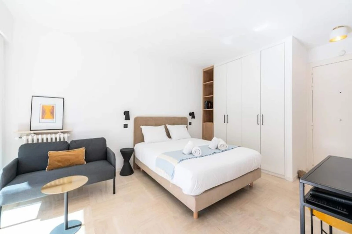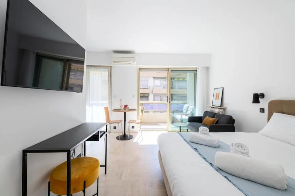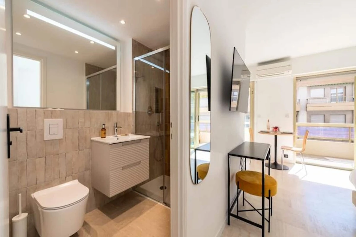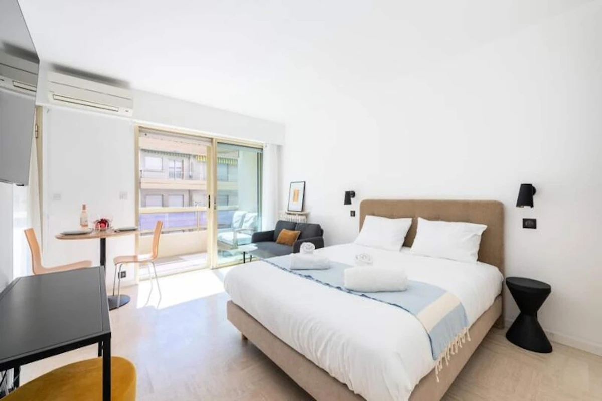 Geniet van de bruisende charme van Cannes in dit lichte studio-appartement, perfect gelegen in het hart van de stad. Op slechts een korte wandeling van gouden stranden en chique boetieks, nodigt dit gezellige toevluchtsoord stellen uit om de allure van de Franse Rivièra te ervaren. Of u nu koffie drinkt op het terras op het zuiden of de nabijgelegen iconische bezienswaardigheden verkent, elk moment hier voelt als een viering van mediterrane elegantie. Het terras, badend in het zonlicht, biedt een serene ruimte om te ontspannen onder de azuurblauwe hemel en legt de essentie van het leven aan de kust vast. Binnen is de studio zorgvuldig ontworpen om comfort en functionaliteit te combineren. Een luxe queensize bed zorgt voor een rustgevende nachtrust, terwijl de woonkamer, compleet met een tweepersoonsbank en televisie, een ontspannende oase biedt na een dag vol avontuur. De open keuken is van alle gemakken voorzien en nodigt u uit om maaltijden te bereiden met verse lokale ingrediënten van nabijgelegen markten. Een eethoek voor twee voegt een vleugje intimiteit toe, perfect voor romantische avonden. De moderne badkamer met douche maakt de ruimte compleet en biedt zowel gemak als stijl. Stap naar buiten en dompel uzelf onder in de bruisende sfeer van Cannes. De Rue d'Antibes, met zijn modieuze boetieks en levendige cafés, ligt op slechts enkele minuten afstand. De iconische Boulevard de la Croisette, met zijn luxe winkels en zandstranden, nodigt uit tot ontspannen wandelingen. Culturele pareltjes zoals La Malmaison Art Center en historische bezienswaardigheden zoals Le Suquet liggen op loopafstand en bieden een mix van kunst, geschiedenis en adembenemende uitzichten. Voor een vleugje natuur kunt u de veerboot nemen naar Île Sainte-Marguerite en de rustige paden verkennen. Of u nu komt voor de glamour van het Filmfestival van Cannes of gewoon om te genieten van de zon en de zee, dit studio-appartement is uw toegangspoort tot onvergetelijke herinneringen. Met een conciërgeservice tot uw beschikking en doordachte voorzieningen belooft uw verblijf even naadloos als betoverend te zijn.