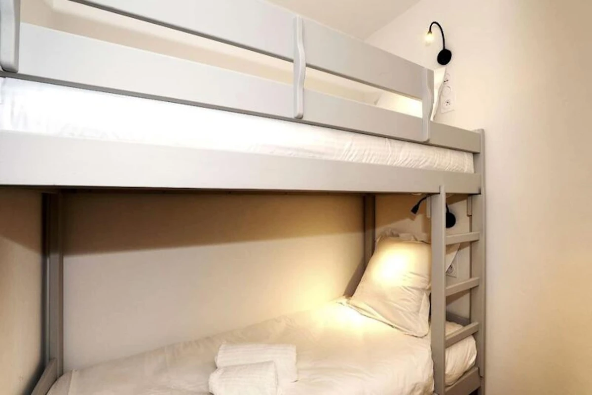 De ruimte van 42 m² is zorgvuldig ontworpen en biedt plaats aan maximaal vier gasten. De woon- en eetkamer komen uit op een balkon op het zuiden, perfect om te genieten van uw ochtendkoffie of een glas wijn 's avonds met een prachtig uitzicht. Een volledig uitgeruste open keuken voldoet aan al uw culinaire wensen, met moderne apparatuur zoals een keramische kookplaat, magnetron, vaatwasser en zelfs een fondueset voor gezellige avonden thuis. De hoofdslaapkamer beschikt over een comfortabel tweepersoonsbed en toegang tot het balkon, terwijl een charmante hut met stapelbedden een gezellige plek biedt voor kinderen of extra gasten. Een strakke badkamer met inloopdouche maakt de ruimte compleet en zorgt voor zowel comfort als stijl. Extra voorzieningen zijn onder andere wifi, een overdekte parkeerplaats, een gedeelde skiopslag en toegang tot een gemeenschappelijke wasruimte.