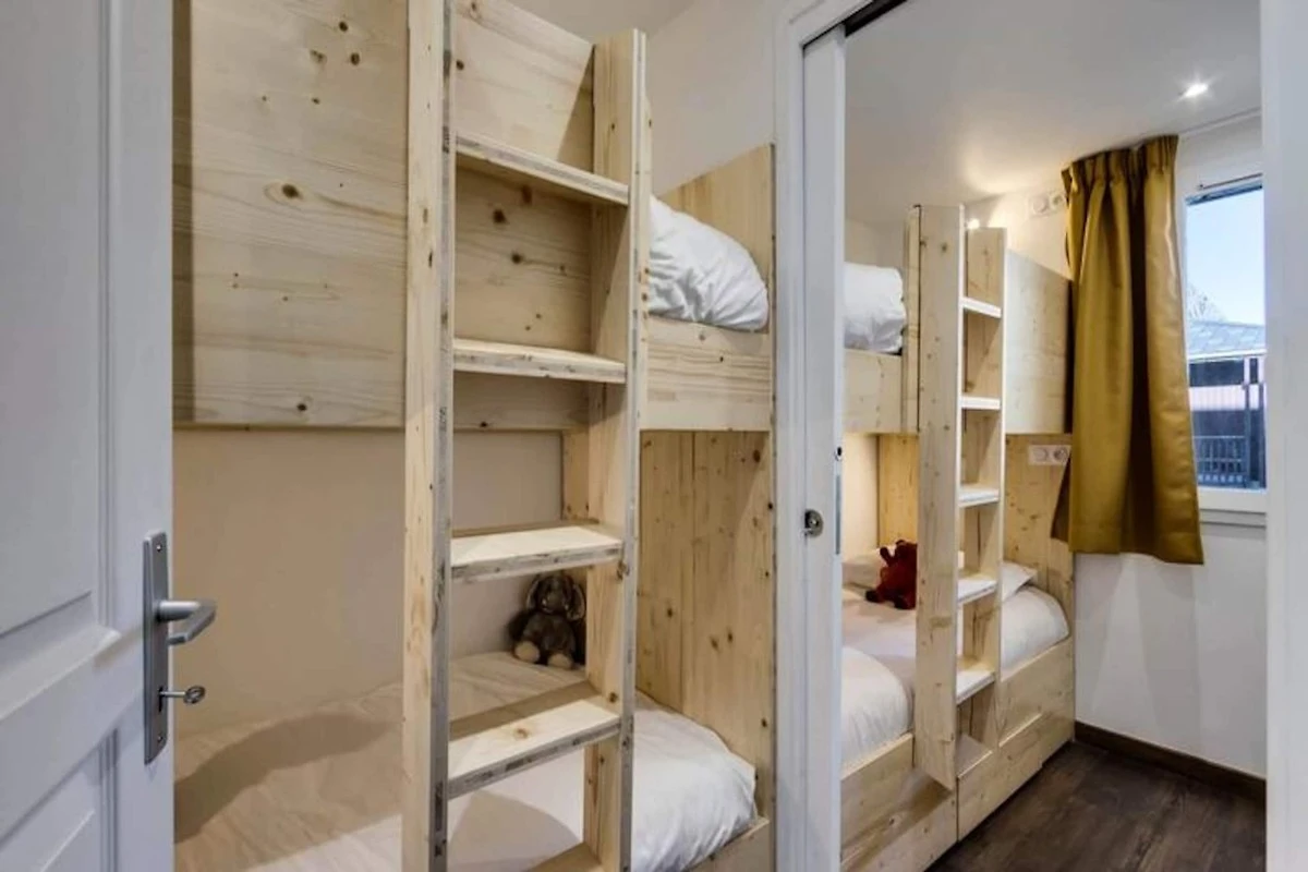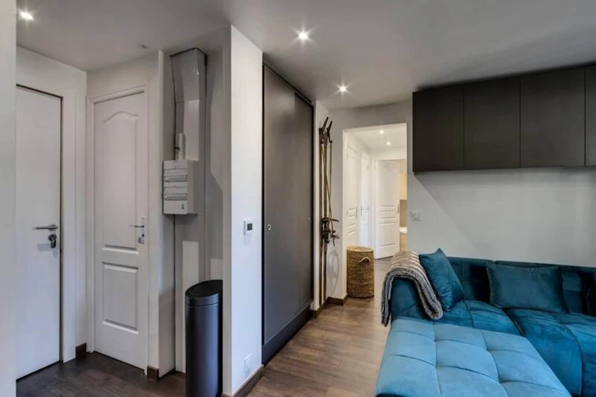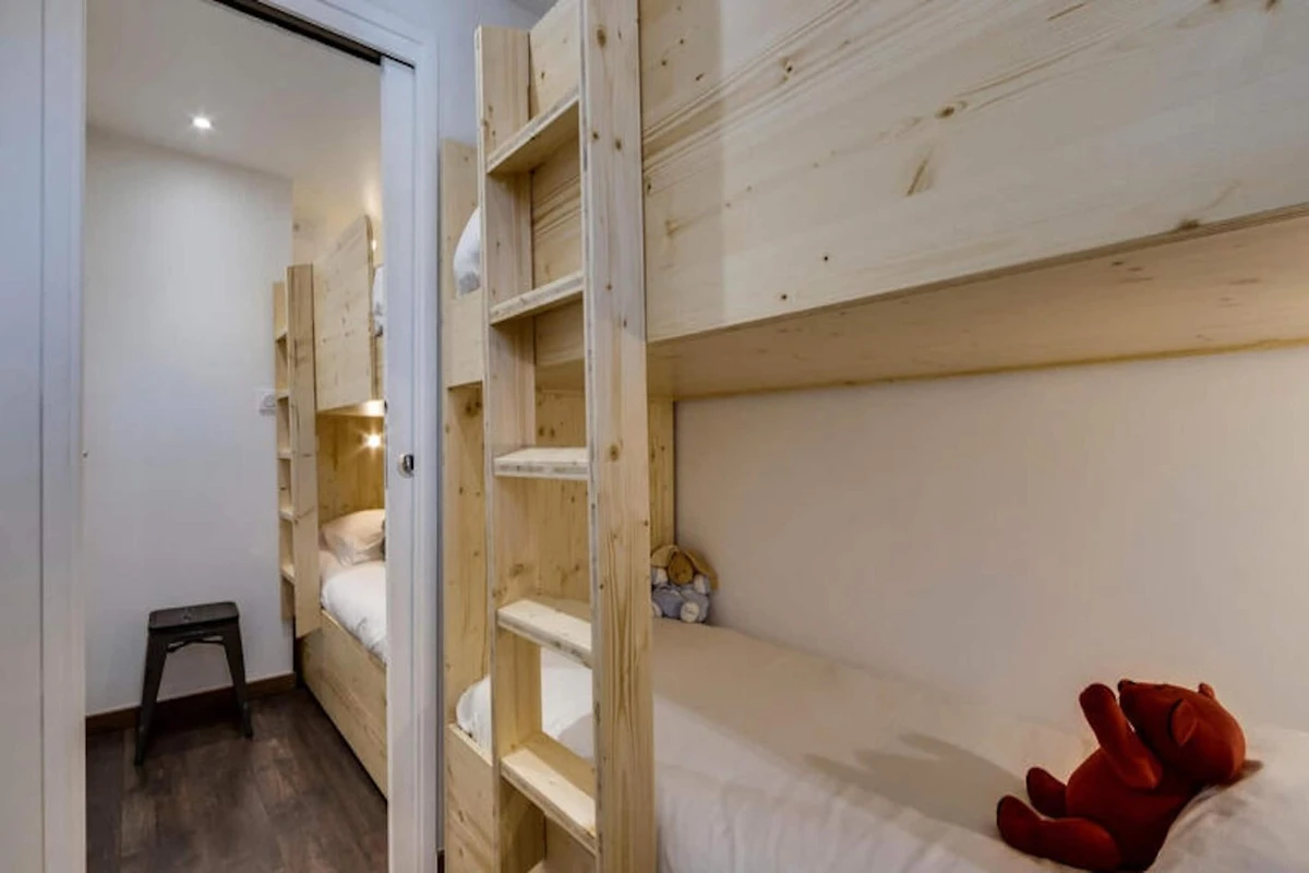 Te midden van de serene charme van de wijk Balme in Val d'Isère biedt dit prachtig gerenoveerde appartement een harmonieuze mix van rust en gemak. Op slechts een korte loopafstand van het dorpscentrum hebben gasten gemakkelijke toegang tot de pistes, winkels en bruisende activiteiten in het resort. Of u nu de pittoreske straatjes verkent of naar de skiliften gaat, de gratis gele trein zorgt voor een soepele reis gedurende de hele dag. Vanaf het balkon op het noorden van het appartement kunt u genieten van de frisse berglucht en het adembenemende uitzicht bewonderen dat Val d'Isère tot een gewilde bestemming maakt voor zowel winter- als zomeruitstapjes. \n\nOntworpen met nauwgezette aandacht voor detail, biedt dit appartement op de tweede verdieping comfortabel plaats aan maximaal vier gasten. De hoofdslaapkamer is voorzien van een luxe tweepersoonsbed en voldoende opbergruimte, terwijl de tweede slaapkamer een comfortabel stapelbed heeft, ideaal voor kinderen of vrienden. Twee moderne badkamers met verwarmde handdoekrekken zorgen voor comfort na een dag vol avontuur, en het aparte toilet zorgt voor extra gemak. De volledig uitgeruste keuken, compleet met inductiekookplaat, oven, magnetron en vaatwasser, nodigt u uit om heerlijke maaltijden te bereiden en te delen aan de eettafel in de ruime woonkamer. Ontspan op de grote bank, geniet van de flatscreen-tv of blijf verbonden met de snelle wifi. Extra voorzieningen zijn onder andere een skiberging met schoendrogers, een wasruimte met wasmachine en droger, en een overdekte parkeerplaats direct onder de residentie. Met restaurants zoals Le Garage en L'Arbre de Vie in de buurt, evenals bruisende uitgaansgelegenheden zoals Le Bbar en La Baraque, is er voor elk wat wils. Skiverhuur bij INTERSPORT Front de Neige MATTIS biedt gemak en exclusieve kortingen, zodat u klaar bent om de piste op te gaan. Of u nu komt voor opwindend skiën, schilderachtige wandelpaden of gewoon om te ontspannen in het hart van de Franse Alpen, dit appartement belooft een onvergetelijk verblijf. Laat u betoveren door de magie van Val d'Isère en creëer onvergetelijke herinneringen in dit elegante alpenresort.