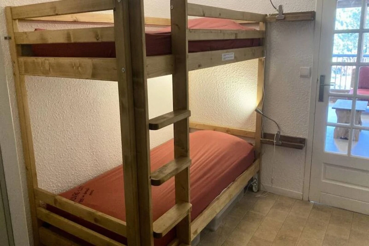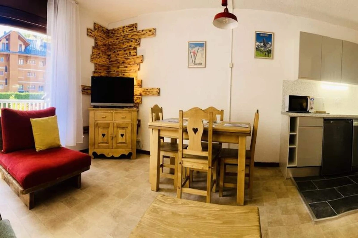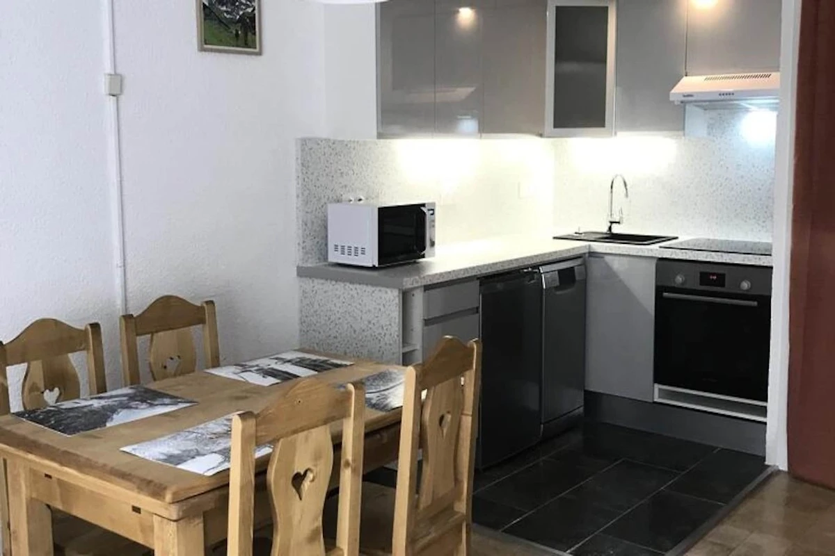 De residentie beschikt over een zorgvuldig ontworpen woonruimte met een balkon op het zuiden dat u uitnodigt om te genieten van het adembenemende uitzicht op de bergen. De woonkamer is voorzien van een comfortabele slaapbank en de entree heeft een stapelbed, waardoor het ideaal is voor gezinnen of kleine groepen. De kitchenette is volledig uitgerust met moderne apparatuur, waaronder een inductiekookplaat, oven, magnetron, koelkast en vaatwasser, zodat u alles heeft wat u nodig heeft voor een comfortabel verblijf. De badkamer is voorzien van een douche, wasmachine en haardroger, terwijl een apart toilet voor extra gemak zorgt. Extra voorzieningen zijn onder andere een televisie, skiopslag en toegang tot een gedeelde parkeerplaats.