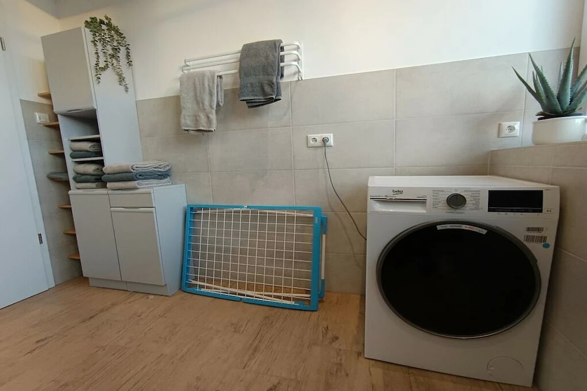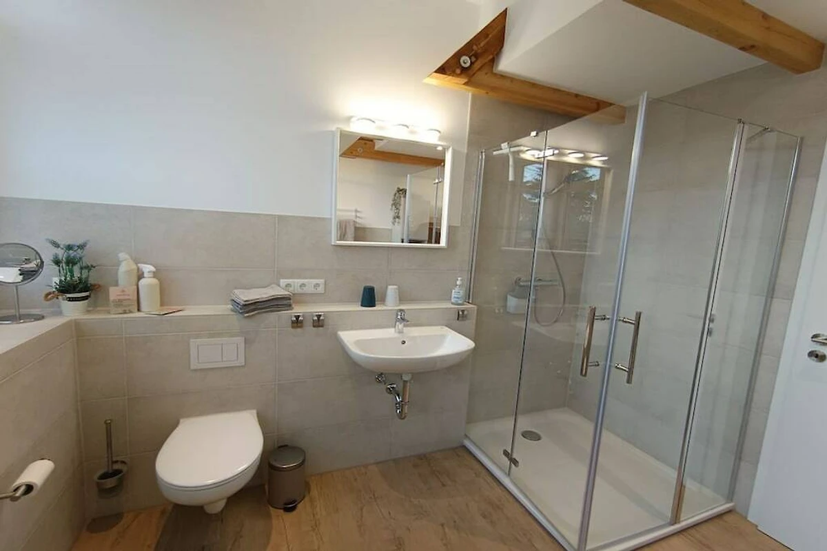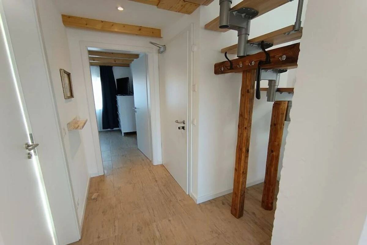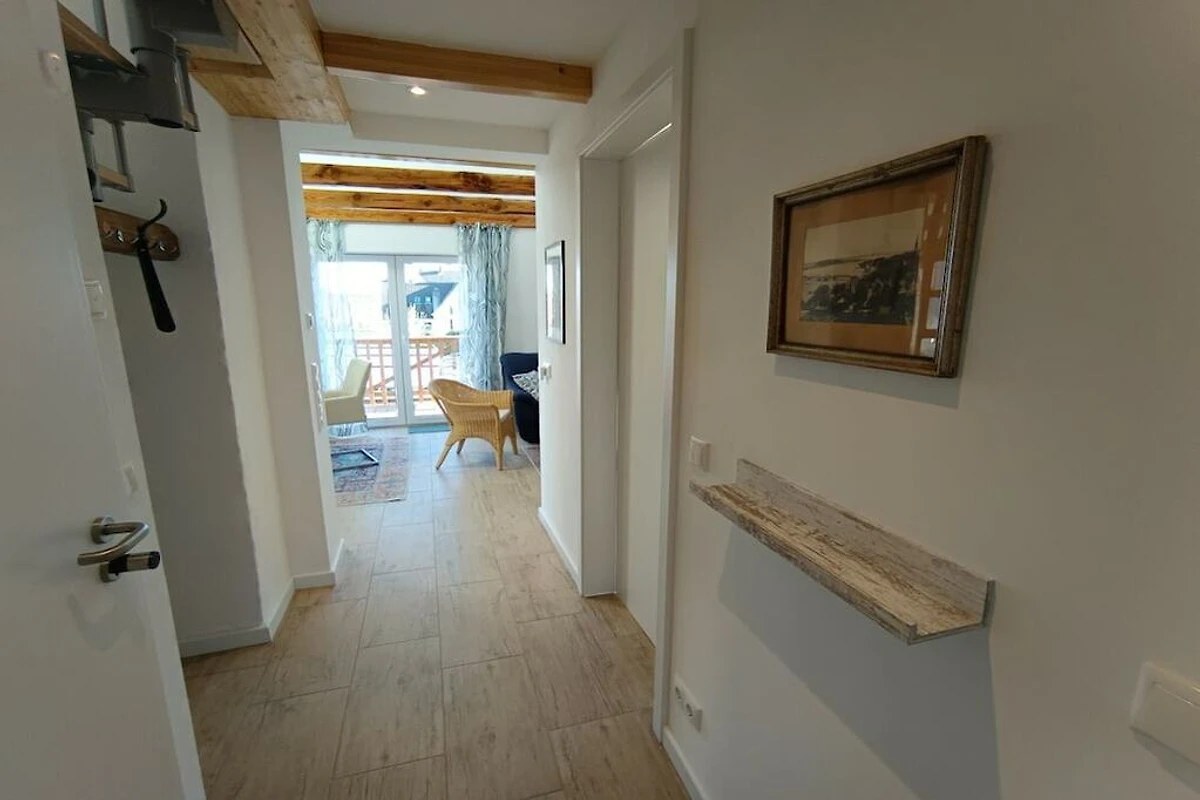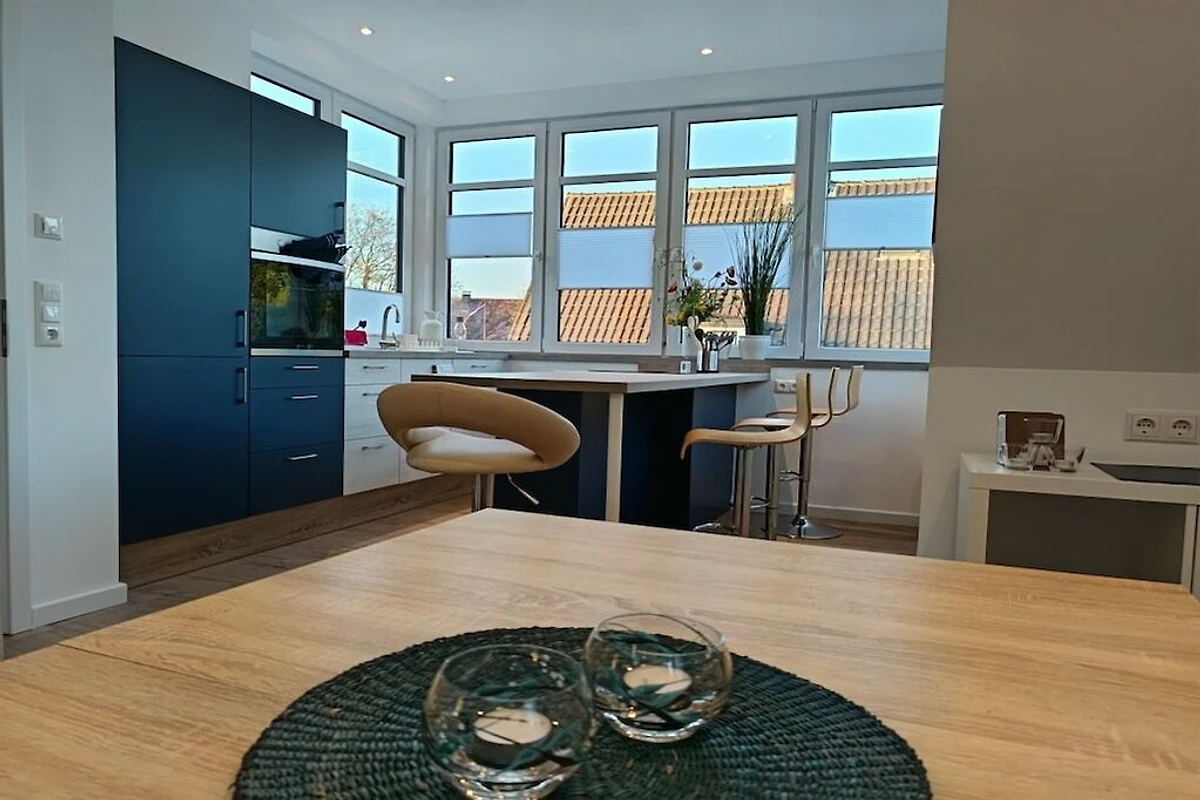 Dit comfortabel en modern ingerichte vakantieappartement is voorzien van vloerverwarming en tegelvloeren op de benedenverdieping, terwijl de mezzanine is voorzien van houten vloerdelen. De lichte woon-, eet- en keukenruimte loopt door tot aan de topgevel en biedt uitzicht op de tuin. De keuken, met zijn schiereiland en barkrukken, is perfect om samen te koken of te genieten van een kopje koffie. De uitschuifbare eettafel biedt voldoende ruimte voor maaltijden, spelletjesavonden en gezellige gesprekken onder het genot van een glas wijn. Twee banken nodigen u uit om 's avonds te ontspannen met een smart-tv of een aangenaam gesprek.