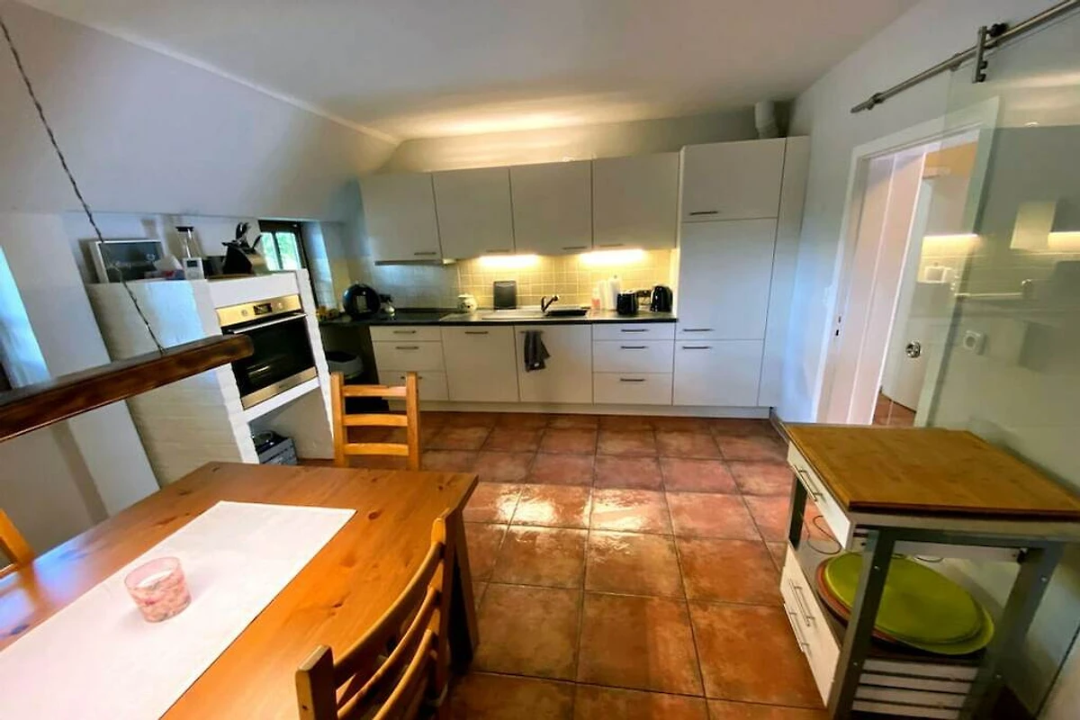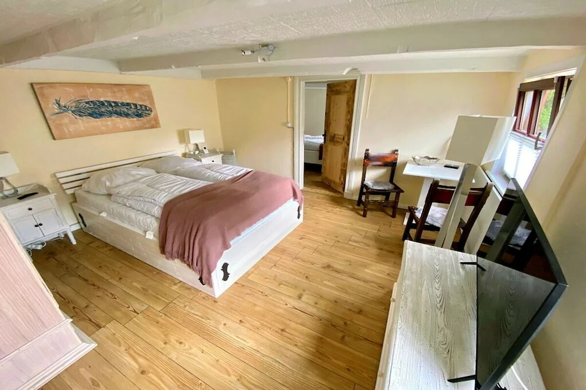 Rookvrij huis. Keuken, badkamer, toilet, woonkamer, serre met zithoek, 3 slaapkamers met tweepersoonsbedden, 3 tv's, wifi, 100 Mbps DSL. Grote buitenruimte, gazon, Weber gasbarbecue, grote tuintafel voor 10 personen op het terras, tuinstoelen, dubbele carport, fietsenstalling, gereedschap voor motoren of andere reparaties. Schommel, hangmat, badminton, jeu de boules, spellencollectie. Let op de bedmaten die vermeld staan in de individuele kamerbeschrijvingen/uitrusting voor het meenemen van eigen beddengoed. Beddengoed kan op verzoek en tegen een meerprijs worden verstrekt.