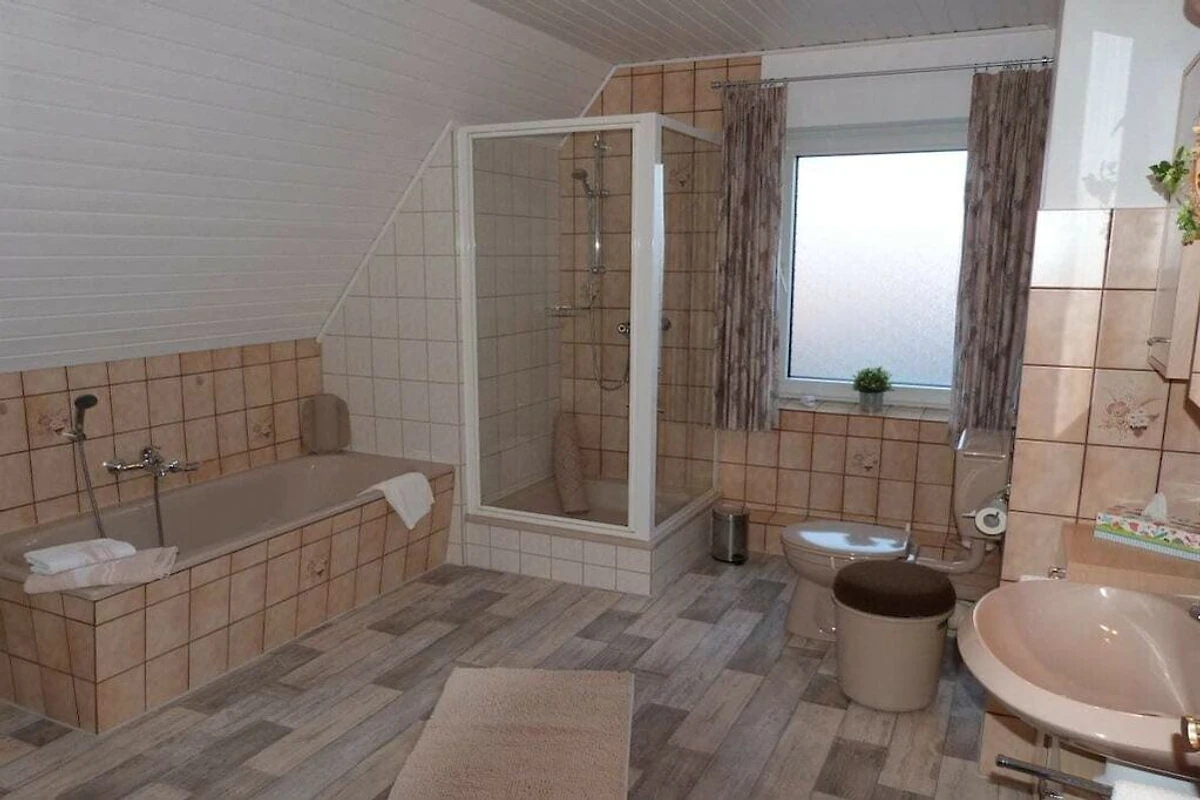 Op de 1e etage: (woonkamer(, , TV, TV, DVD-speler, DVD-speler, CD-speler, horren), keuken(, , , kitchenette, eettafel, kachel, stereo-installatie, kookplaat, waterkoker, broodrooster, koffiezetapparaat, oven, magnetron, afwasmachine, koelkast, vriezer, kinderstoel, horren), slaapkamer(, , 2-pers. bed, radio, kinderbed, horren), slaapkamer(, , 1-pers. bed, 1-pers. bed, horren), badkamer(, , toilet, ligbad, douche, wastafel, wasmachine, haardroger, horren), berging(, strijkplank, strijkijzer, Droogkamer))