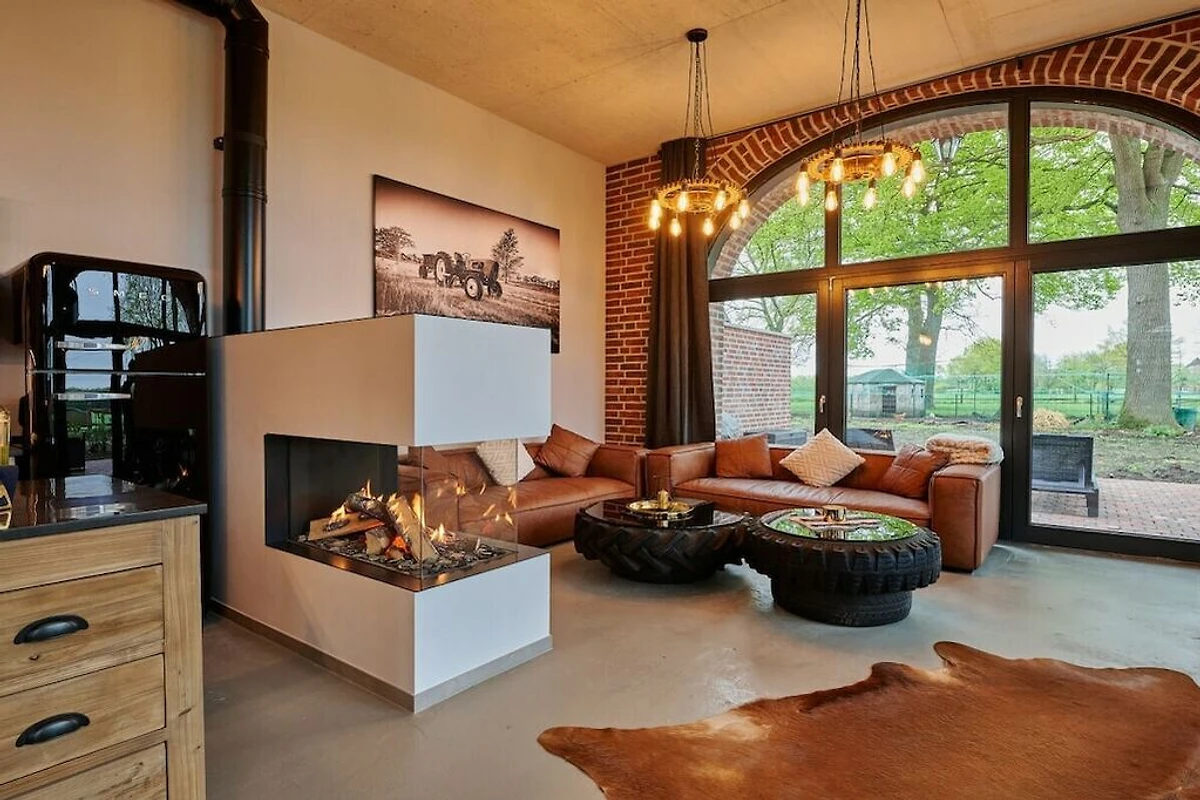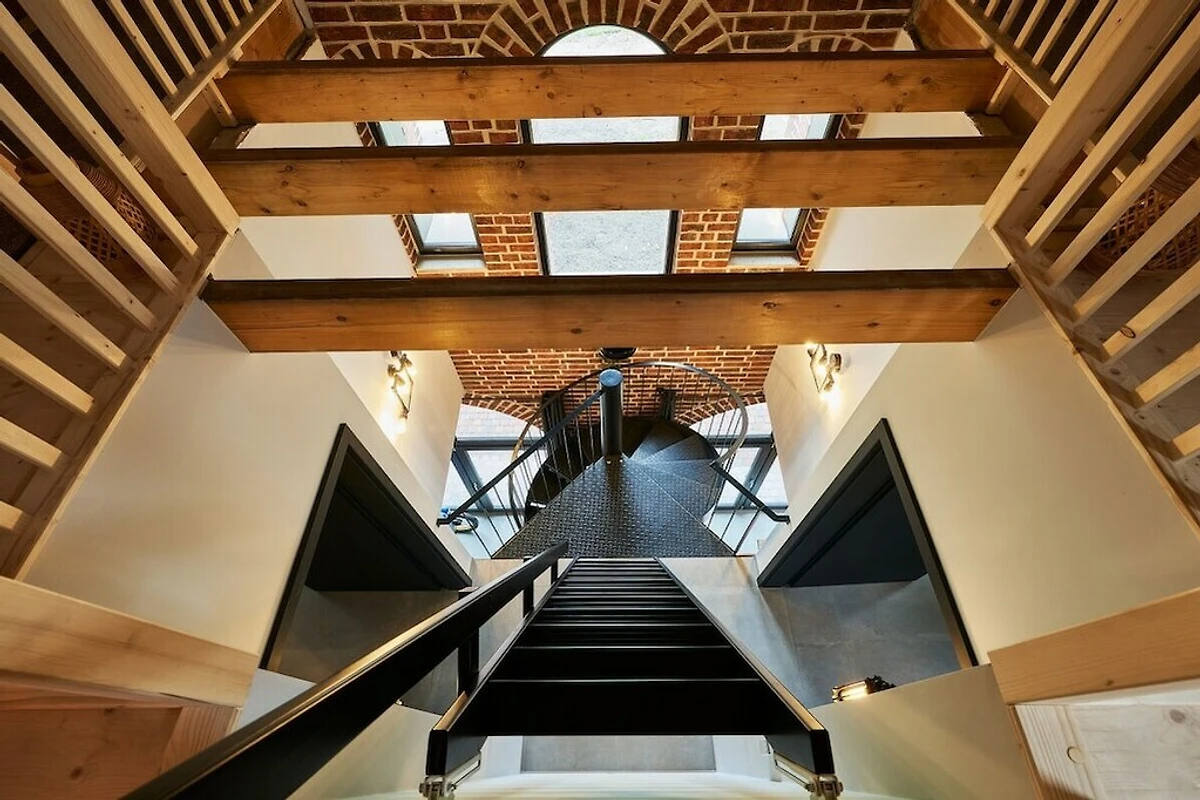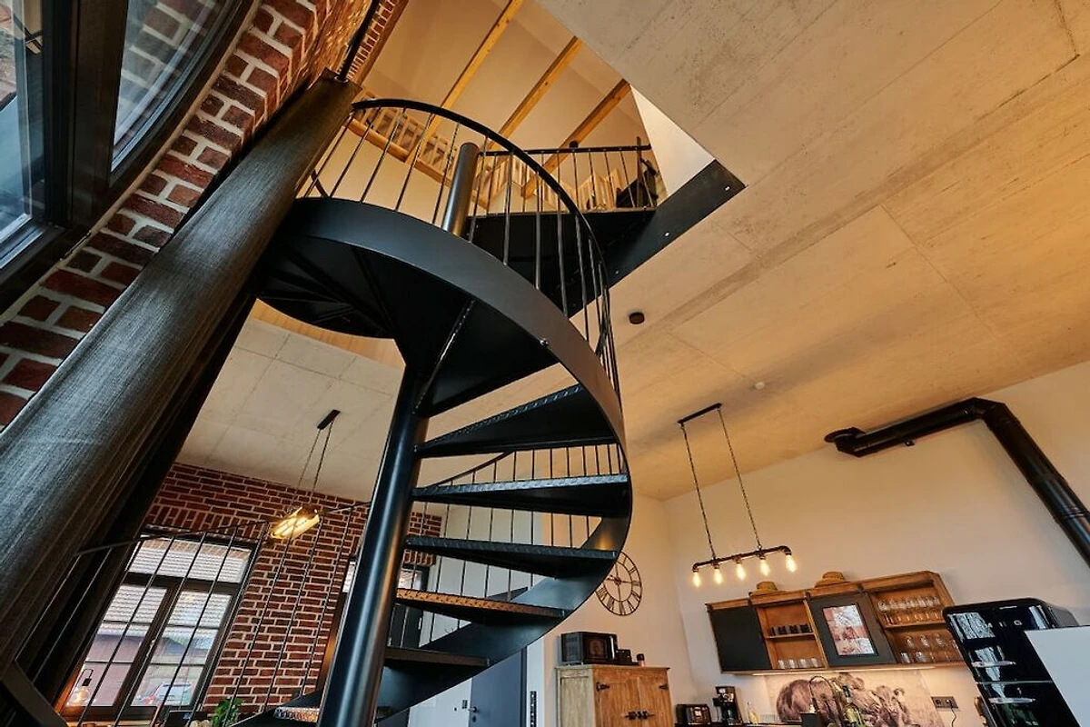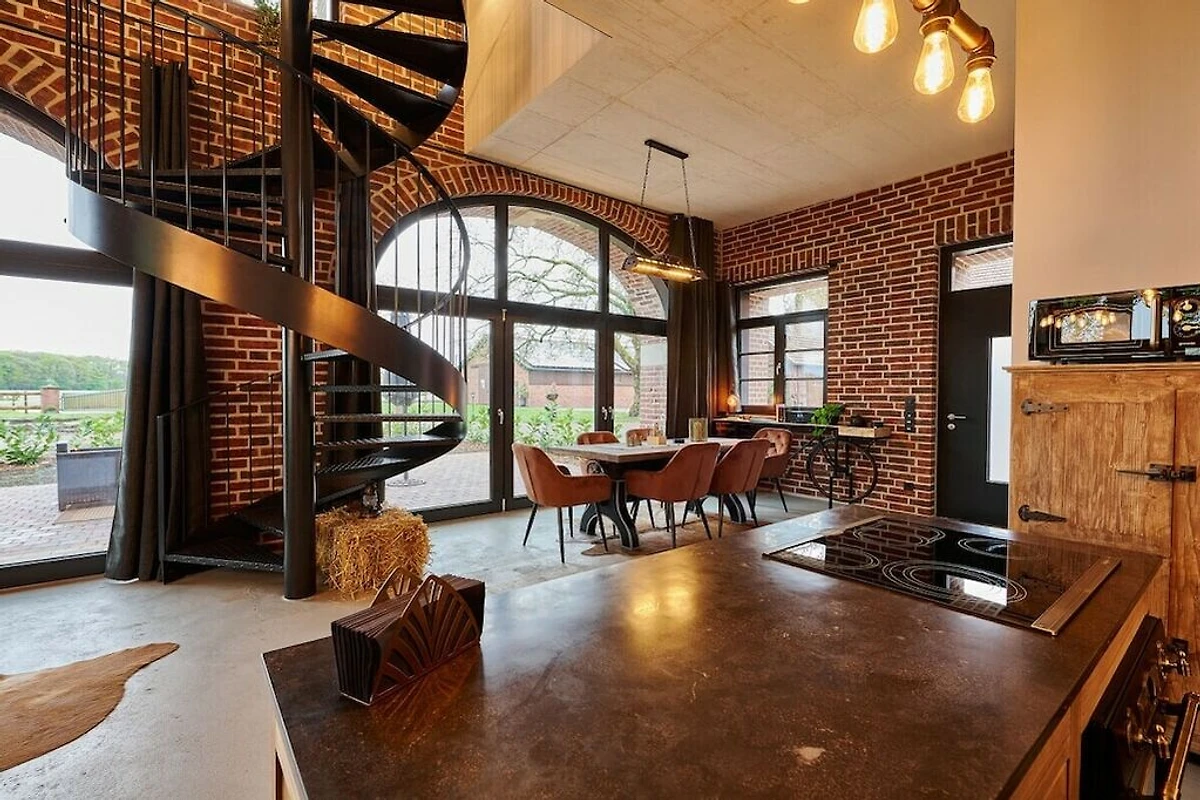 Een exclusief, ruim vakantieappartement met airconditioning wacht op u, verdeeld over drie verdiepingen in een verbouwde schuur. Het karakter van het oude gebouw combineert naadloos met de moderne, industriële inrichting. Ongeveer 100 vierkante meter woonoppervlakte wordt aangevuld door twee terrassen met tuinmeubelen en een houtskoolgrill. Op de begane grond vindt u een royale, industriële keuken met een open woonkamer. Deze is volledig uitgerust met een oven, magnetron, broodrooster, koffiezetapparaat, waterkoker en vaatwasser. De uitnodigende woonkamer is voorzien van twee buffellederen banken, een grote flatscreen-tv en een open haard. Een gastenbadkamer met douche, wastafel en toilet bevindt zich ook op de begane grond. Een stalen trap leidt naar de eerste verdieping, waar u twee slaapkamers vindt. Elke slaapkamer is voorzien van een tweepersoonsbed, een kledingkast, een vrijstaand bad en een flatscreen-tv. Een glazen deur leidt naar de aangrenzende badkamer met douche, toilet en wastafel. Een uitklapbare houten ladder in de hal op de eerste verdieping geeft toegang tot de zolder. Er zijn twee comfortabele eenpersoonsbedden in het appartement aanwezig, ideaal als u met meer dan vier personen reist. Naast het appartement bevindt zich een wasruimte met een droger en wasmachine, die u bij een langer verblijf kunt gebruiken.